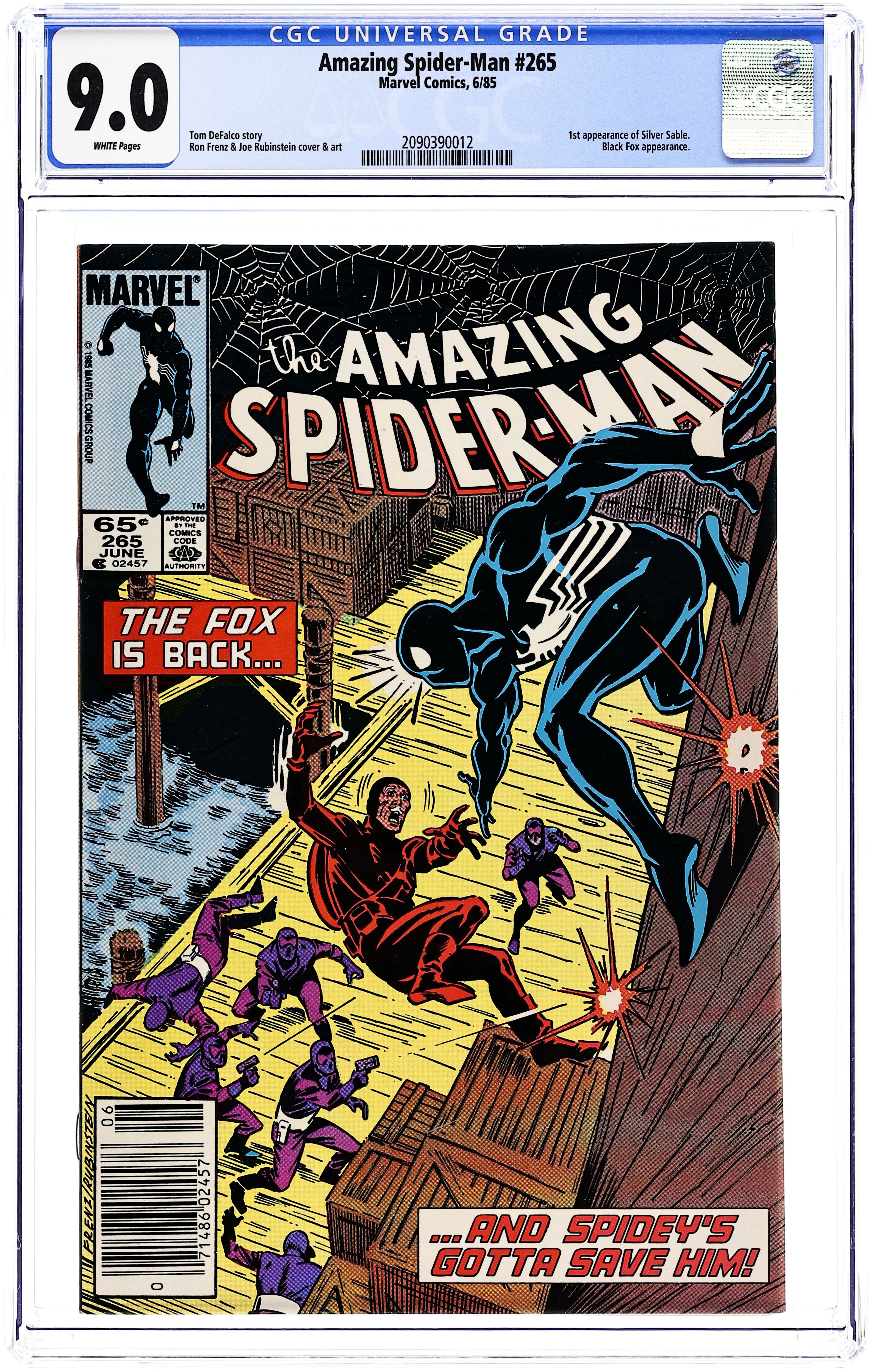 Starts Feb 9 First printing. Newsstand Edition. First appearance of Silver Sable. Script by Tom DeFalco. Pencils by Ron Frenz. Inks by Joe Rubinstein. Cover by Ron Frenz and Joe Rubinstein. "After the Fox!". The Black Fox is on the run! But it's not the Spectacular Spider-Man who's chasing him! It's Silver Sable! An adventurer for hire from the European country of Symkaria! Silver Sable and her Wild Pack pursue the fox through the streets of Manhattan and then later corner him on the waterfront! However, the aging international jewel thief has a wall-crawling guardian angel! Down on the docks, the sparks fly as the web-slinger gives Silver Sable a lesson in diplomacy...superhero-style! Second appearance of the Black Fox. Cameo appearances by Aunt May, Mary Jane Watson, Harry Osborn, Liz Osborn, and Normie Osborn. (Notes: Silver Sable appears next in Amazing Spider-Man 279. The Black Fox returns in Web of Spider-Man 14. There is a second printing of this issue published in 1992. The second printing features a gray cover and a yellow dog ear touting the first appearance of Silver Sable. This story was also reprinted in Marvel Tales 277.) 36 pgs. Cover price $0.65.