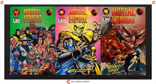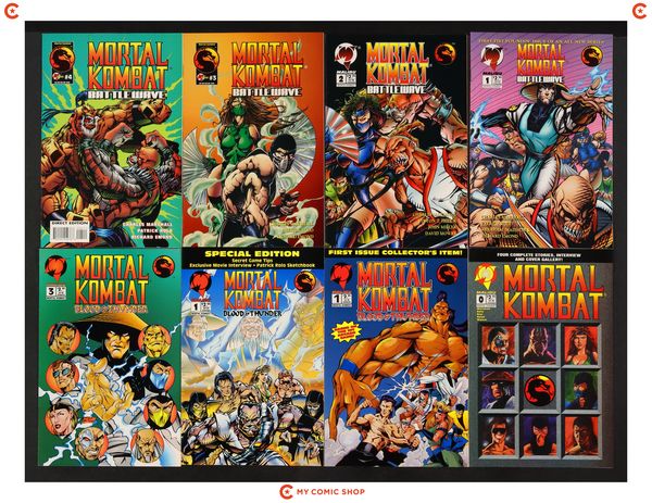 Issues 1-4 of Mortal Kombat Battlewave (1995), issues 0, 1B, 1D.D, 3, 4, 5, and 6 of Mortal Kombat Blood and Thunder (1994). Most will grade in the FN to VF range.