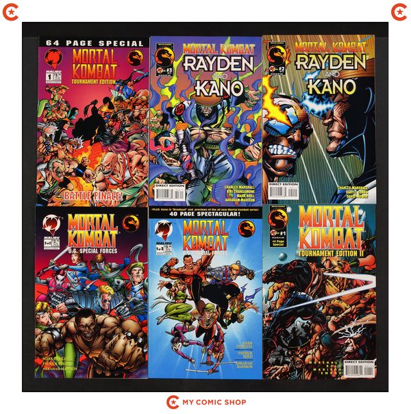 Issue 1 of Mortal Kombat Baraka (1995), 1B, 2D, 3 of Mortal Kombat Goro, Prince of Pain (1994), issue 1 of Mortal Kombat Kitana and Mileena (1995), issues 1B, 2, 3 of Mortal Kombat Rayden and Kano (1995), issue 1 of Mortal Kombat Tournament (1994), issue 1 of Mortal Kombat Tournament II (1995), and issues 1, 2 of Mortal Kombat U.S. Special Forces (1995). Most will grade in the FN/VF to VF range.