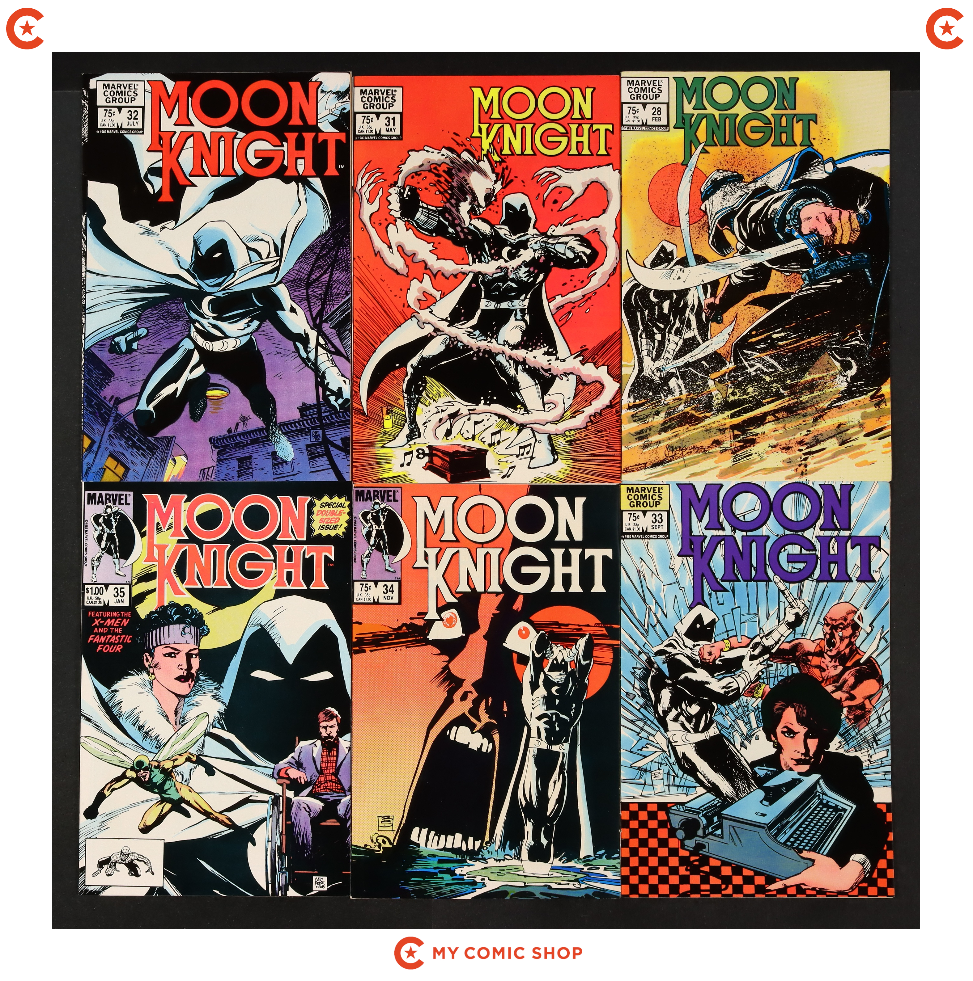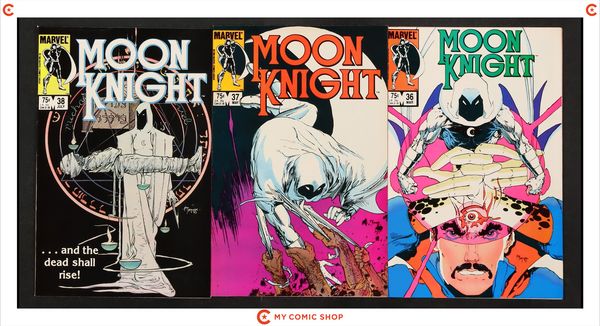 Issues 28, 31, 32, 33, 34, 35, 36, 37, and 38 of Moon Knight (1980 1st Series). Most will grade in the FN to VF range.