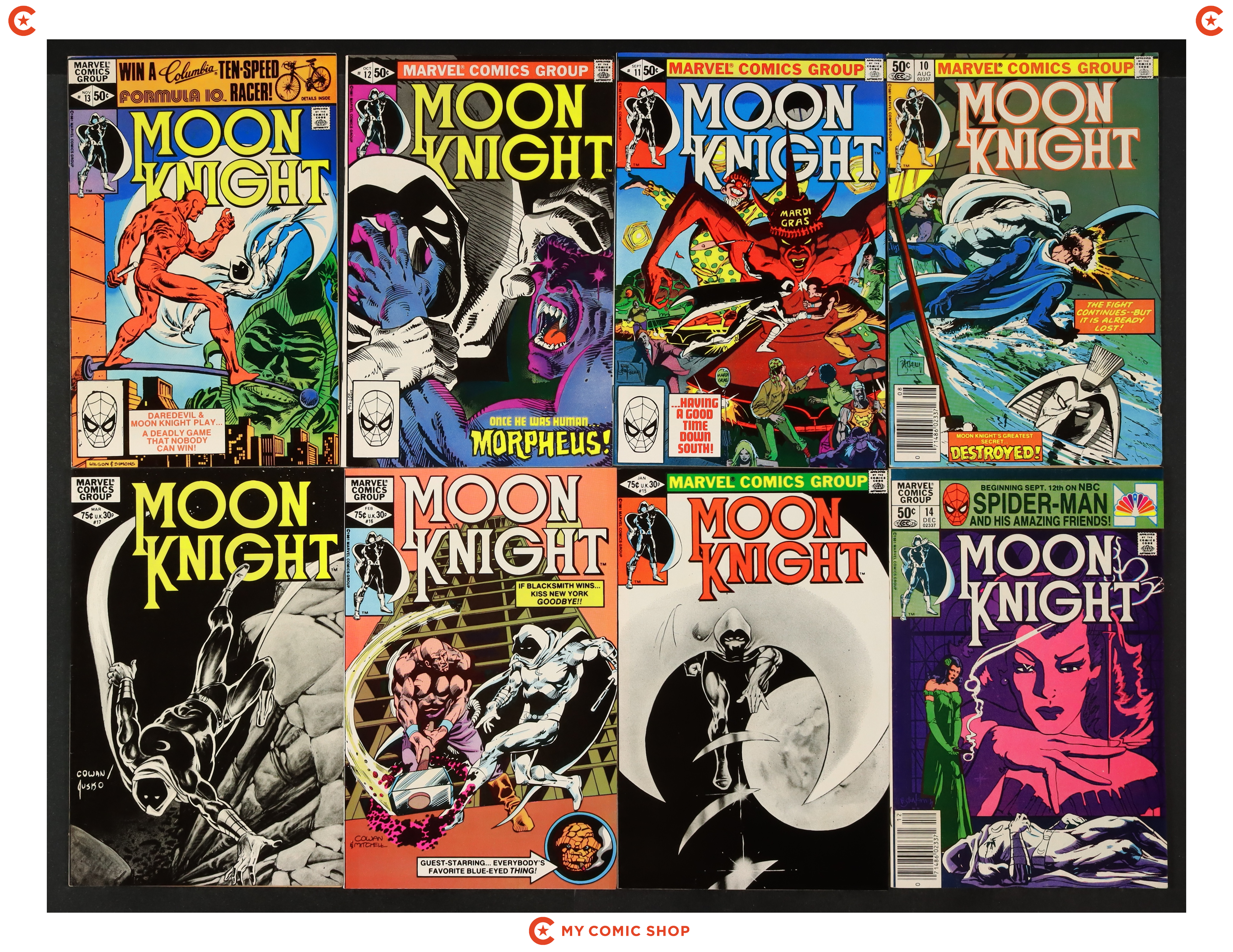 Issues 10N, 11-13, 14N, and 15-17 of Moon Knight (1980 1st Series). Most will grade in the VF to FN range.