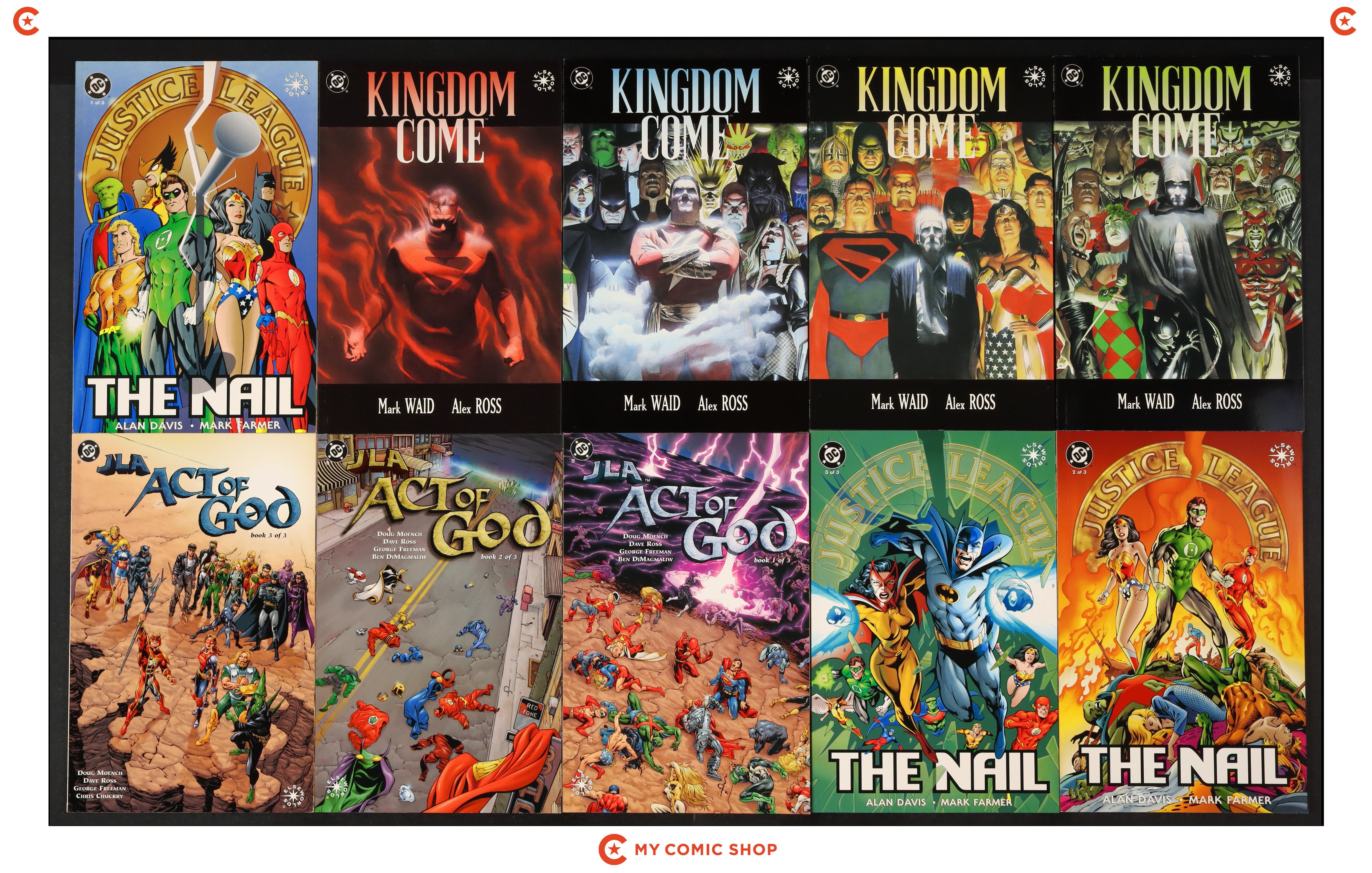 Issues 1-4 of Kingdom Come (1996 DC); 1-3 of Justice League The Nail (1998); and 1-3 of JLA Act of God (2001). Most will grade in the FN+ to VF/NM range.