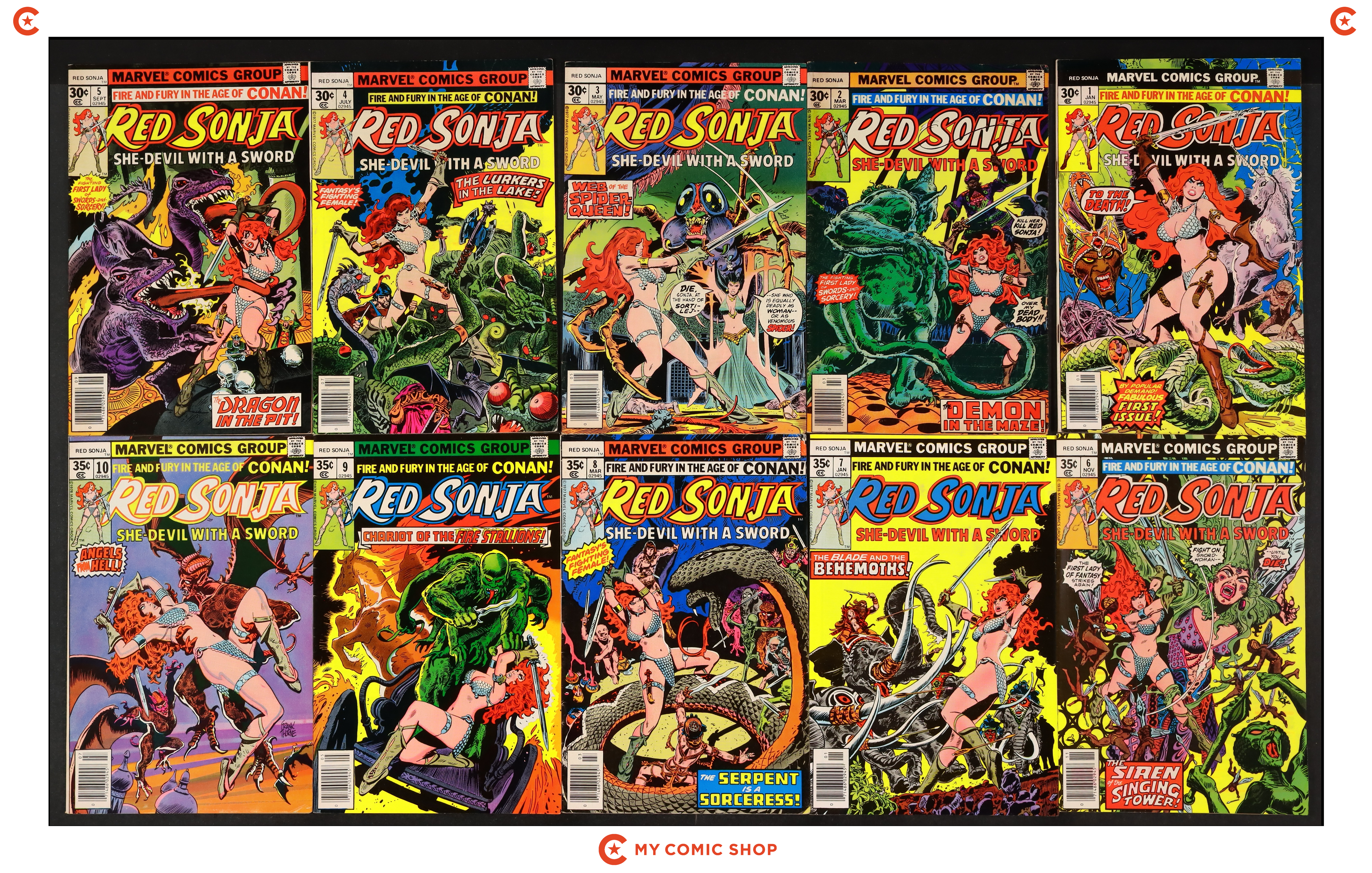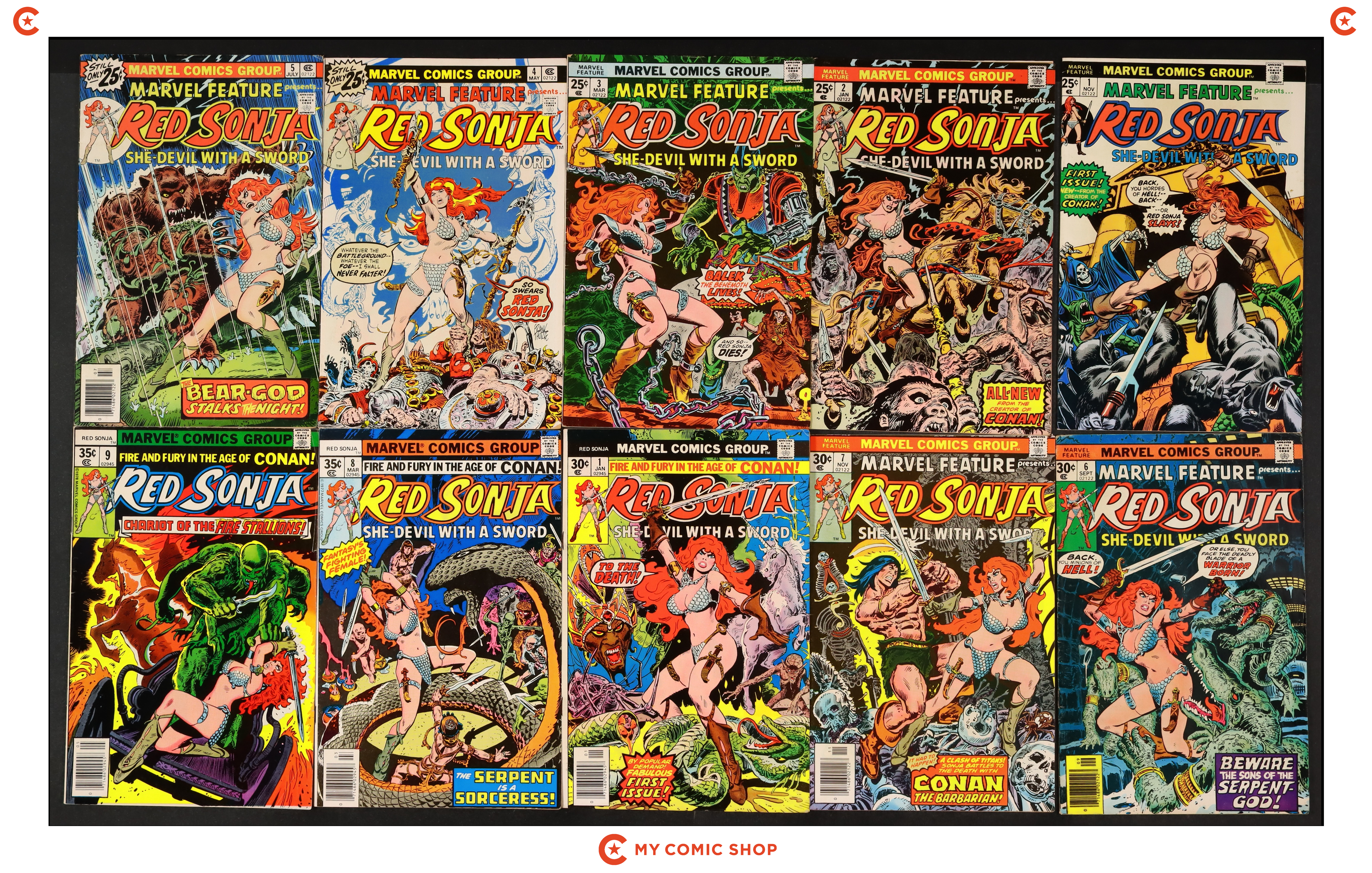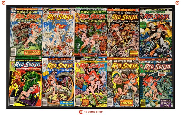 Issues 3-5, and 7 of Marvel Feature (1975 2nd Series); 6UK of Marvel Feature (1975 2nd Series) UK Edition; and 1, 2, and 10 of Red Sonja (1977 1st Marvel Series). Most will grade in the GD range.