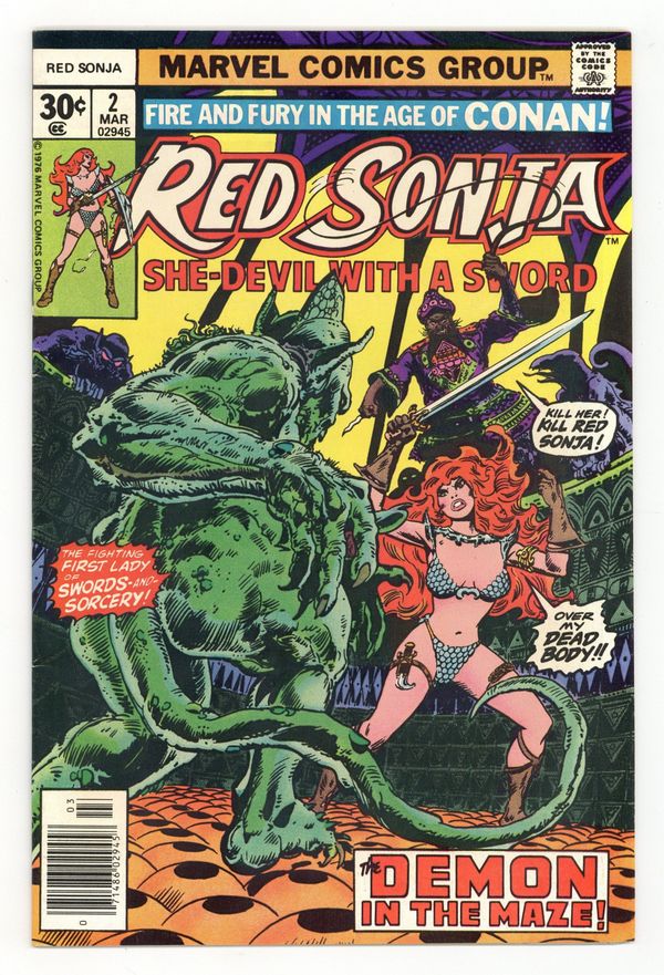 Starts Apr 27 Cover by Frank Thorne. The Demon of the Maze, script by Roy Thomas and Clara Noto, art by Frank Thorne; Red Sonja comes to the port city of Venzia in the kingdom of Argos; After witnessing two sailing vessels crashing into one another, she rescues a young woman from a couple of street brigands; Moments later, a mute thug clobbers Sonja across the back of the head and brings her to the dungeon of a mage known as the Hidden One; When Sonja awakens, she finds herself trapped in a strange maze of mirrors and illusions. Spider-Man stars in a one-page Hostess ad, "The Champ." 36 pgs., full color. $0.30. Cover price $0.30.