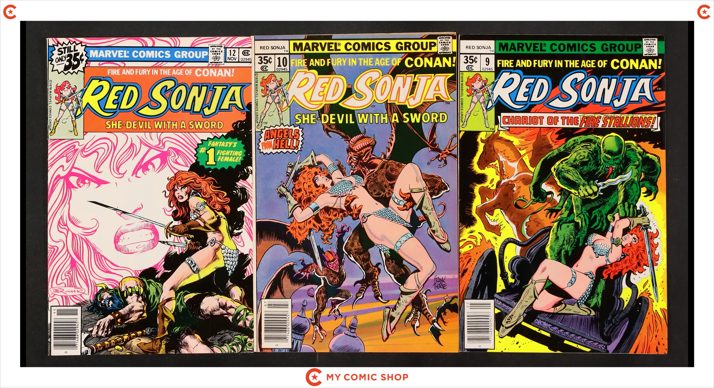 Issues 1-7 of Marvel Feature (1975 2nd Series); and 1, 8, and 9 of Red Sonja (1977 1st Marvel Series). Most will grade in the FN to VG range.