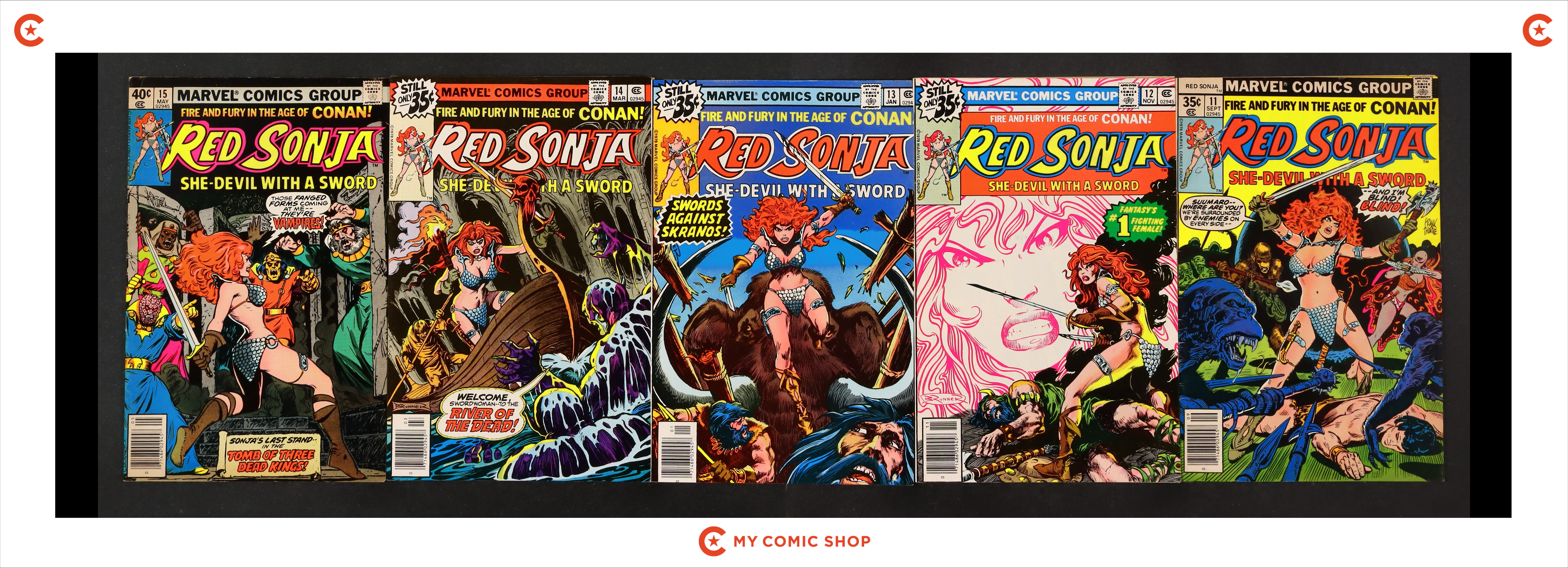 Issues 1-15 of Red Sonja (1977 1st Marvel Series). Most will grade in the FN to VG range with #1 grading GD.