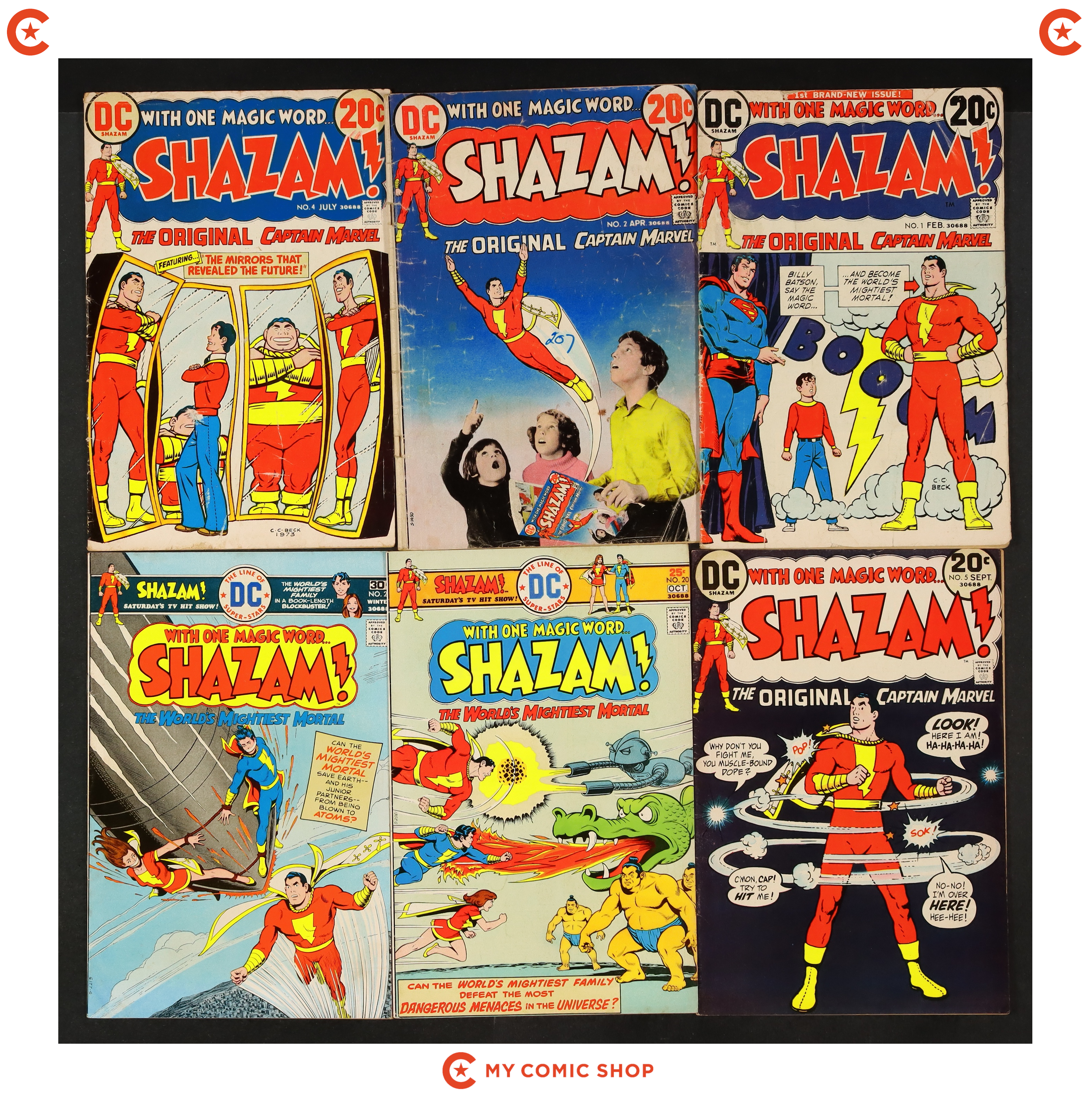 Issues 1, 2, 4, 5, 20, and 23 of Shazam (1973). Most will grade in the VG range with #4 grading GD, and #1 and #2 grading PR (#1-piece missing, does not affect story or art; #2- centerfold missing, affects story or art).