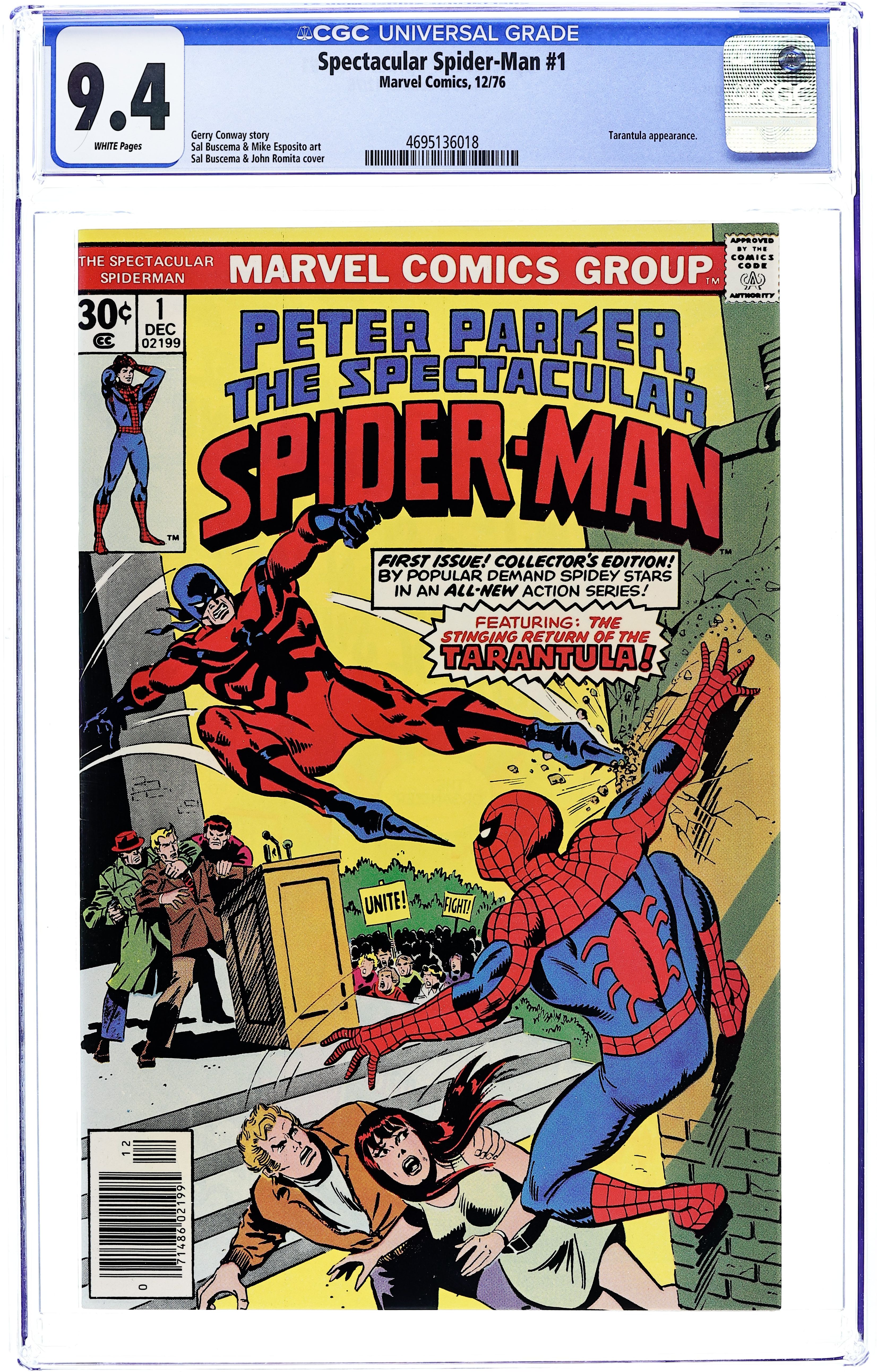 Starts Jul 4 "Twice Stings The Tarantula!" Part 1 of 3. Script by Gerry Conway. Pencils by Sal Buscema. Inks by Mike Esposito. Cover by Sal Buscema and John Romita. The first issue of a brand new series for Spider-Man! The story opens with a bang as the Tarantula kidnaps the Empire State University vice-chancellor, despite the best efforts of the web-slinger, Flash Thompson, and Mary Jane Watson! Next, the Tarantula tries to kill the mayor, but this time the Spectacular Spider-Man is ready! Can the wall-crawler beat the Tarantula and save Mayor Abe Beame? First appearance of Edward Lansky (aka Lightmaster). (Notes: The Spectacular Spider-Man series became the third monthly title for Spider-Man. The first issue of the series debuted the same month as Amazing Spider-Man 163 and Marvel Team-Up 52. The letters page contains an essay from Gerry Conway describing the plans for the new Spider-Man title.) 32 pages Cover price $0.30.