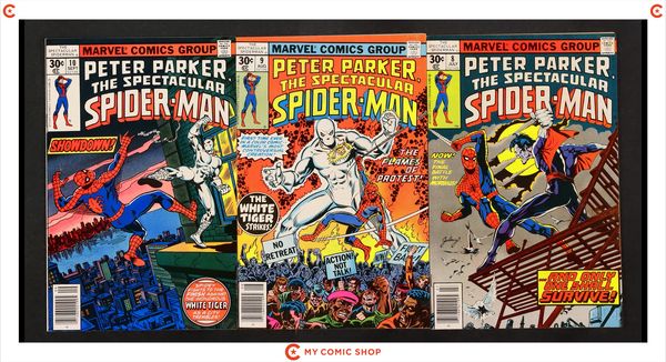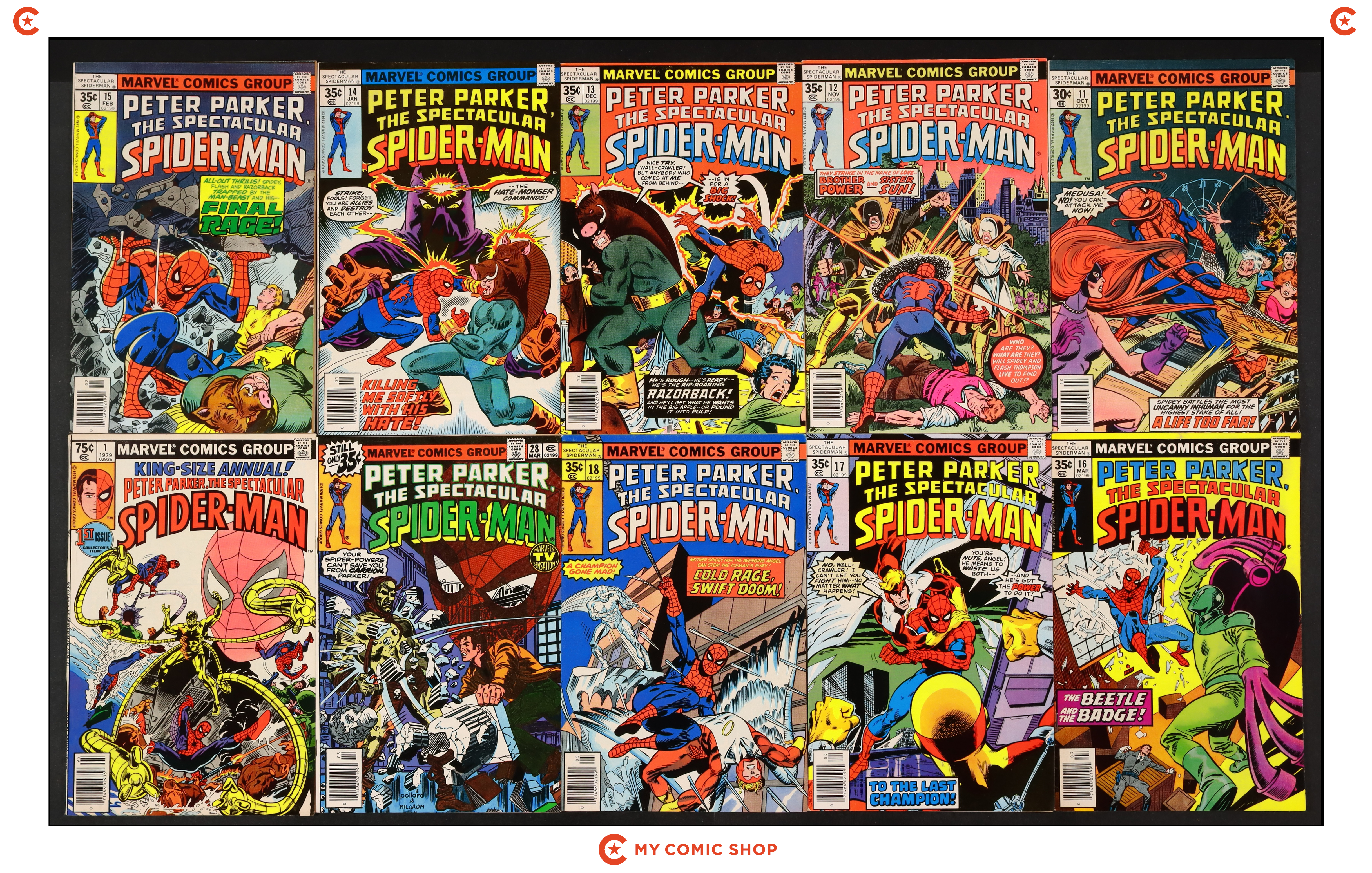 Issues 11-18 and 28 of Spectacular Spider-Man (1976 1st Series); and 1 of Spectacular Spider-Man (1976 1st Series) Annual. Most will grade in the FN range with a couple grading VF.