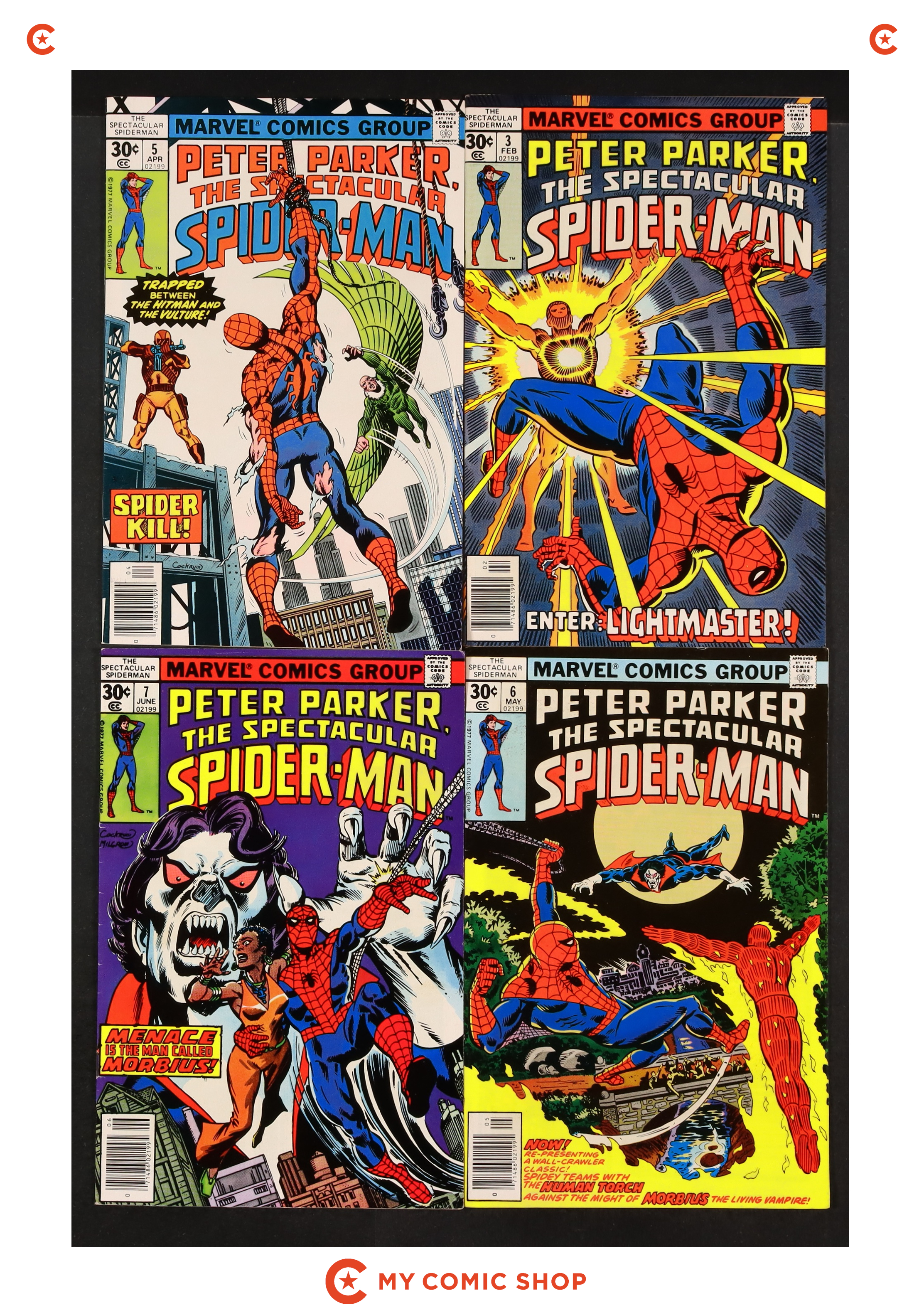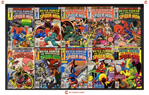 Issues 3 and 5-10 of Spectacular Spider-Man (1976 1st Series). Most will grade in the FN with a few grading VF.