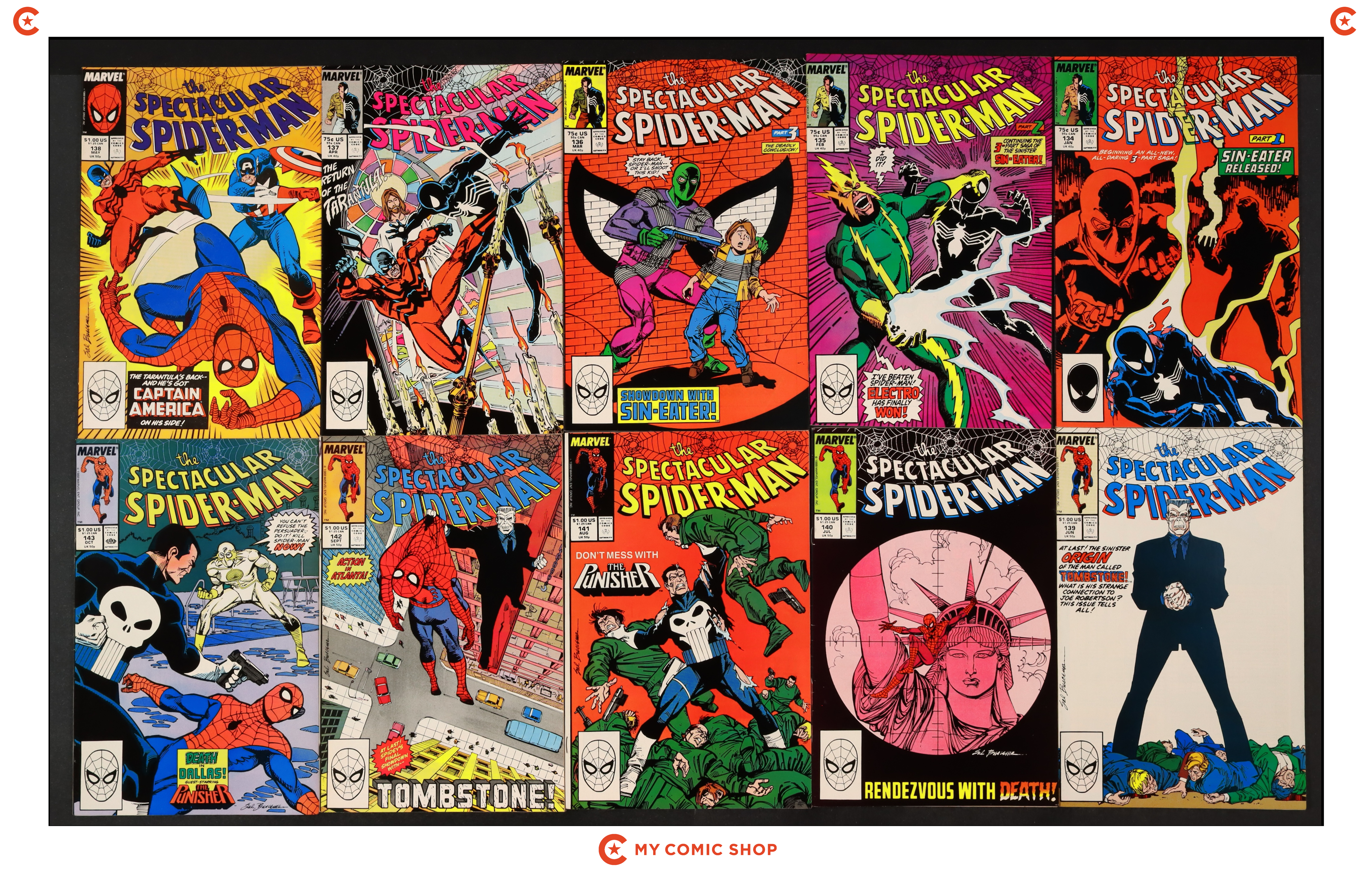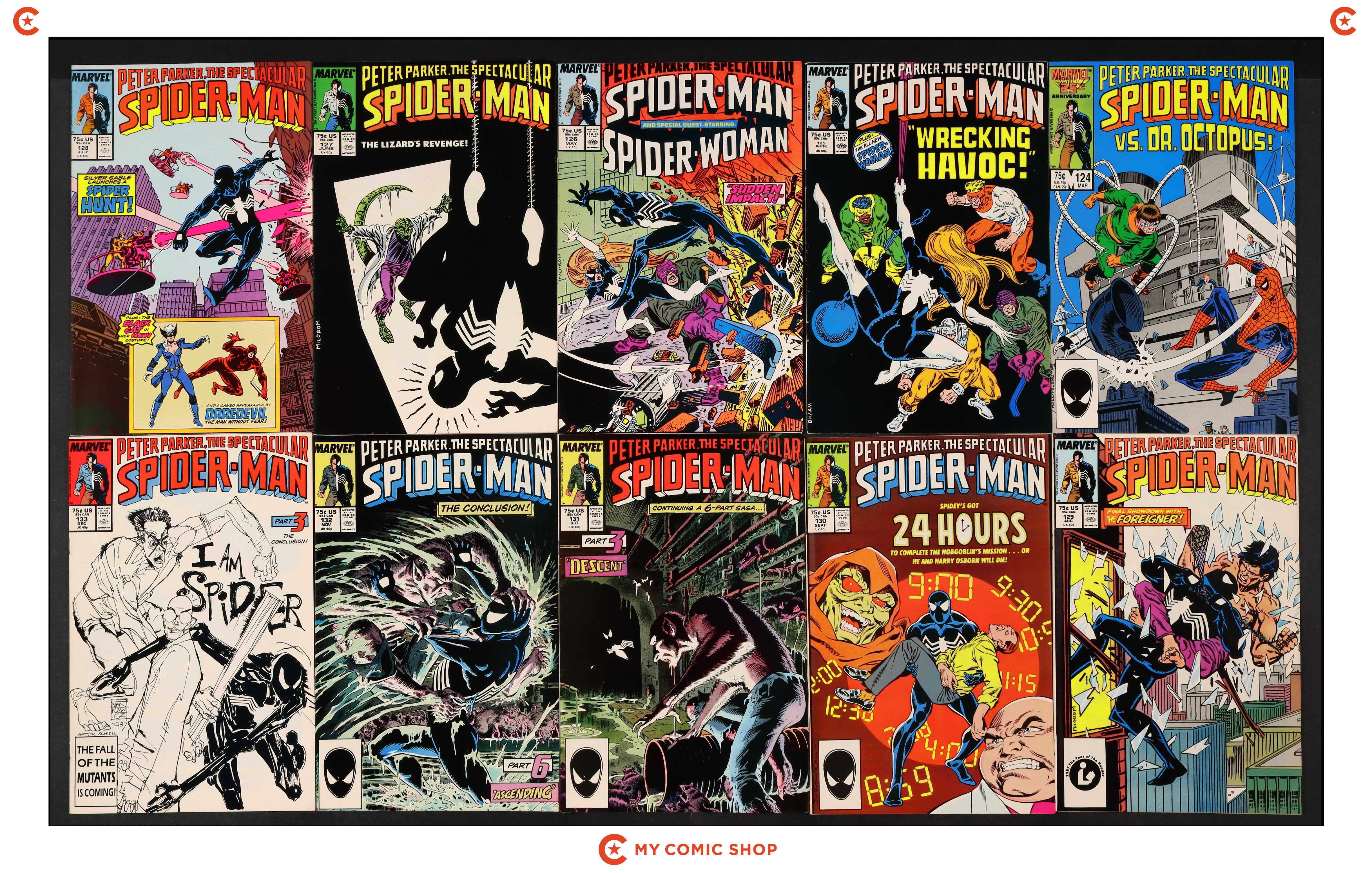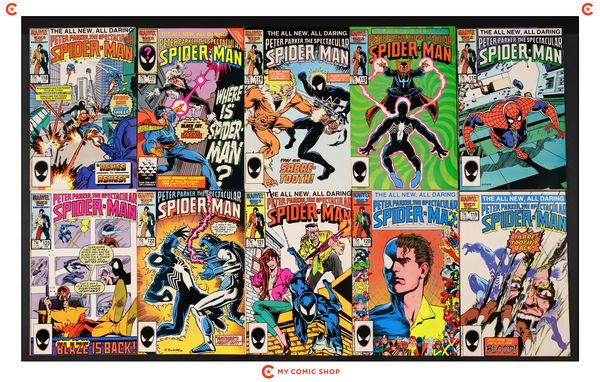 Issues 124-127, 128D, 129, 130D, 131D, 132D, 133D, and 134-143 of Spectacular Spider-Man (1976 1st Series). Most will grade in the FN to VF range.