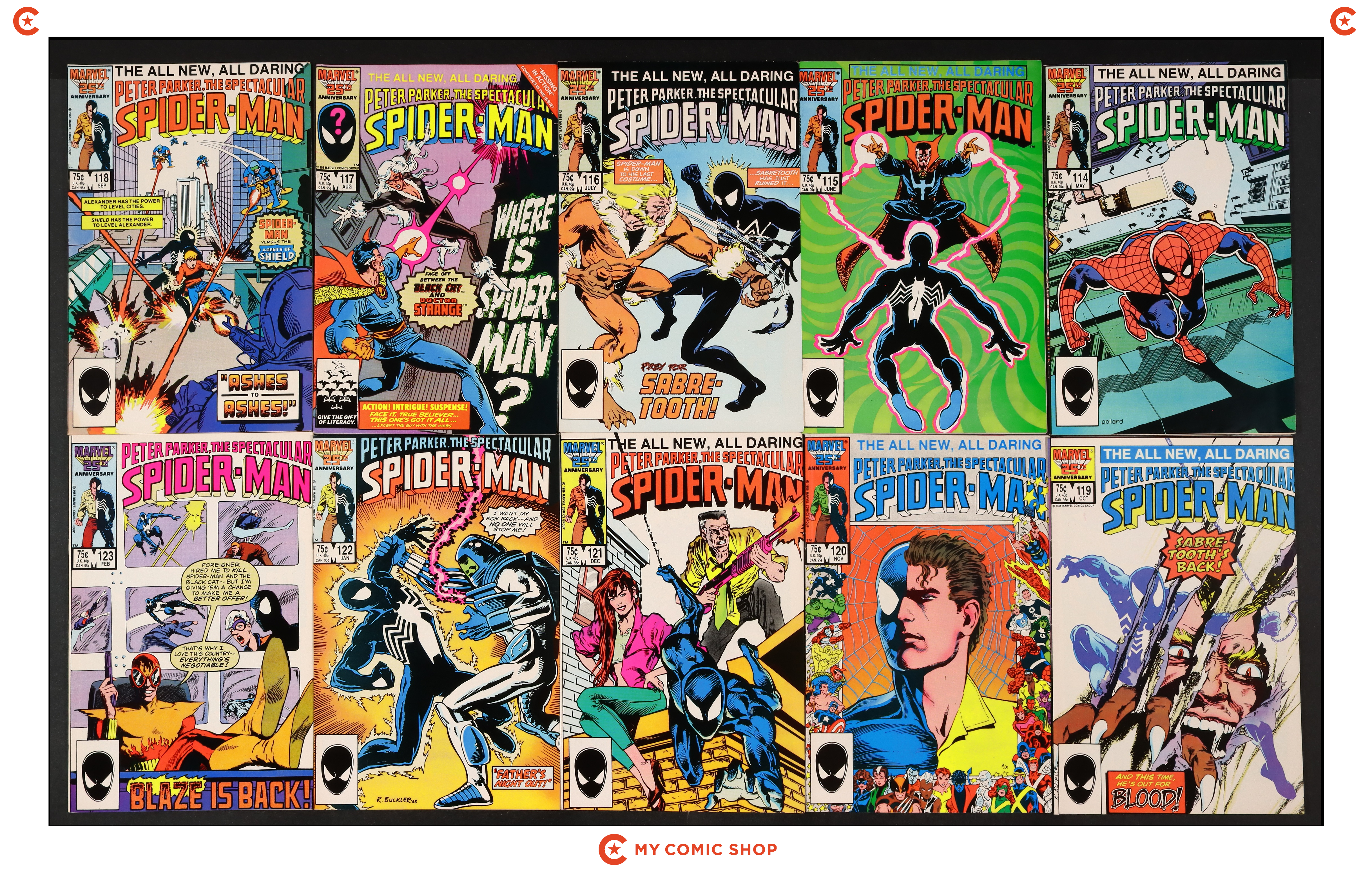 Issues 104N, 105N, 106N, 107N, 108-118, 119D, 120D, and 121-123 of Spectacular Spider-Man (1976 1st Series). Most will grade in the VG to FN range.