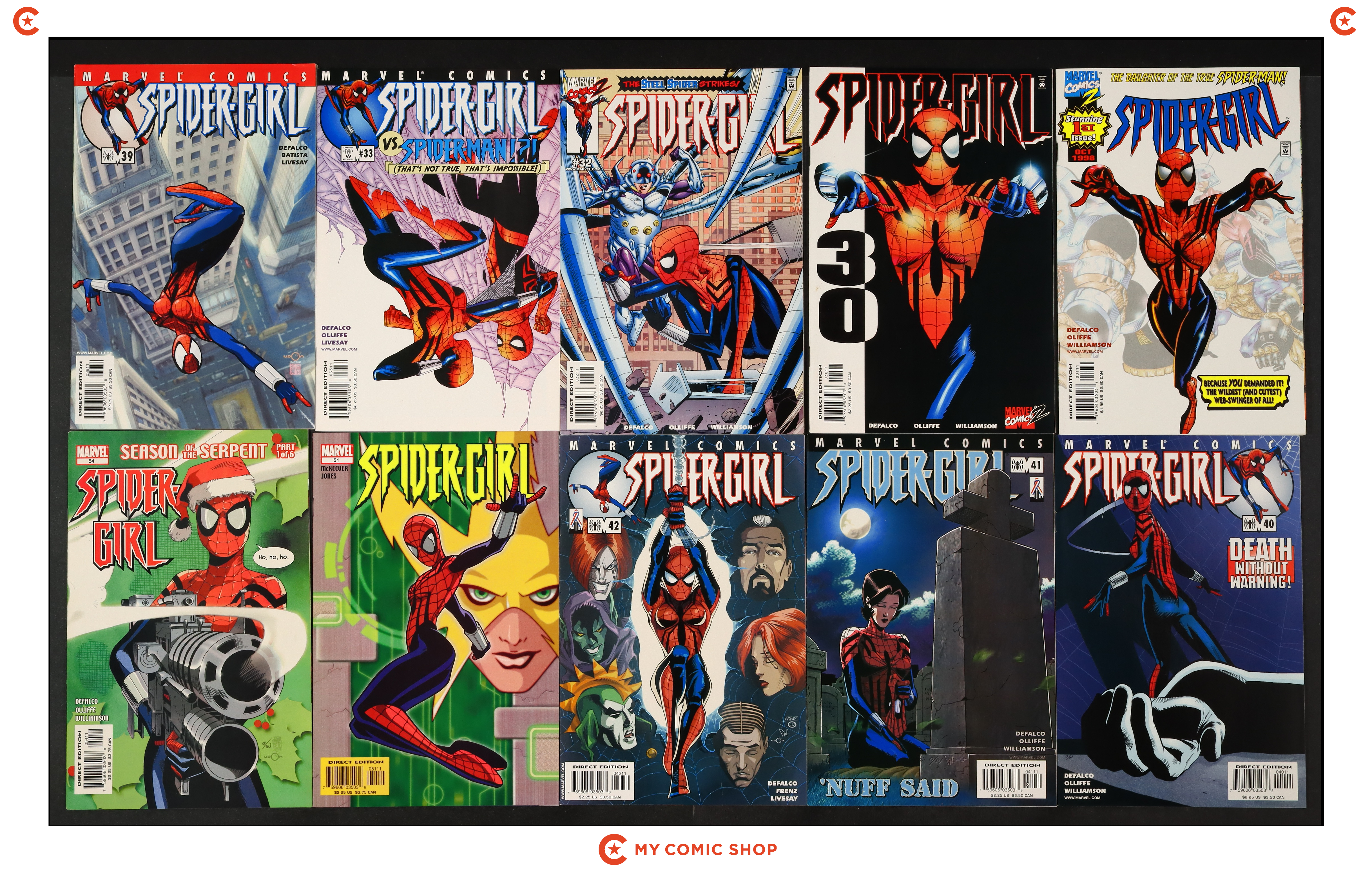 Issues 1, 30, 32, 33, 39-42, 51, 54, 59, 67, and 75-80 of Spider-Girl (1998). Most will grade in the VF range with some grading FN.
