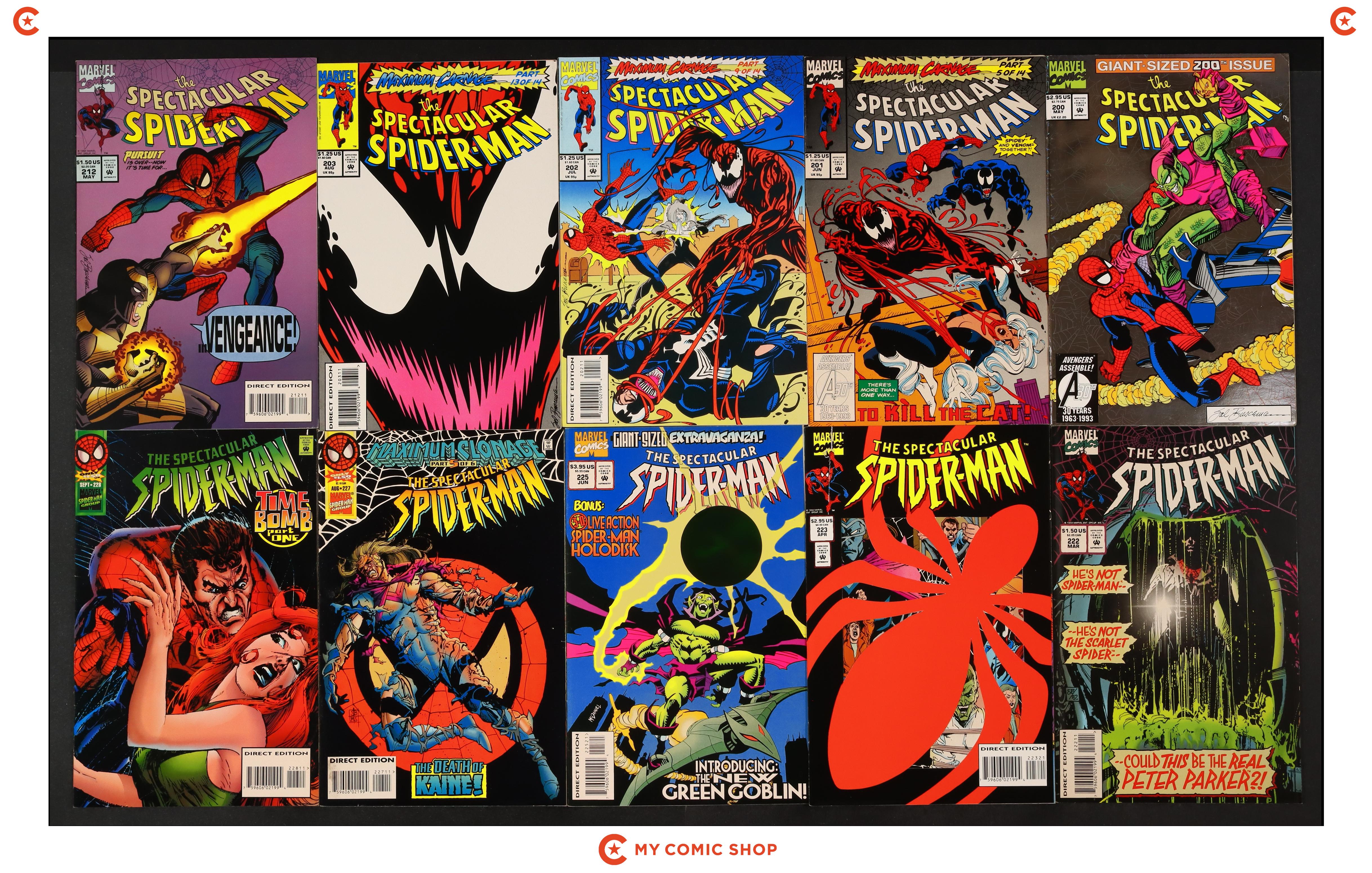 Issues 200D, 201, 202, 203, 212, 222D, 223D, 225, 227, 228, 229A, 231A, and 232-239 of Spectacular Spider-Man (1976 1st Series). Most will grade in the FN to VF range.