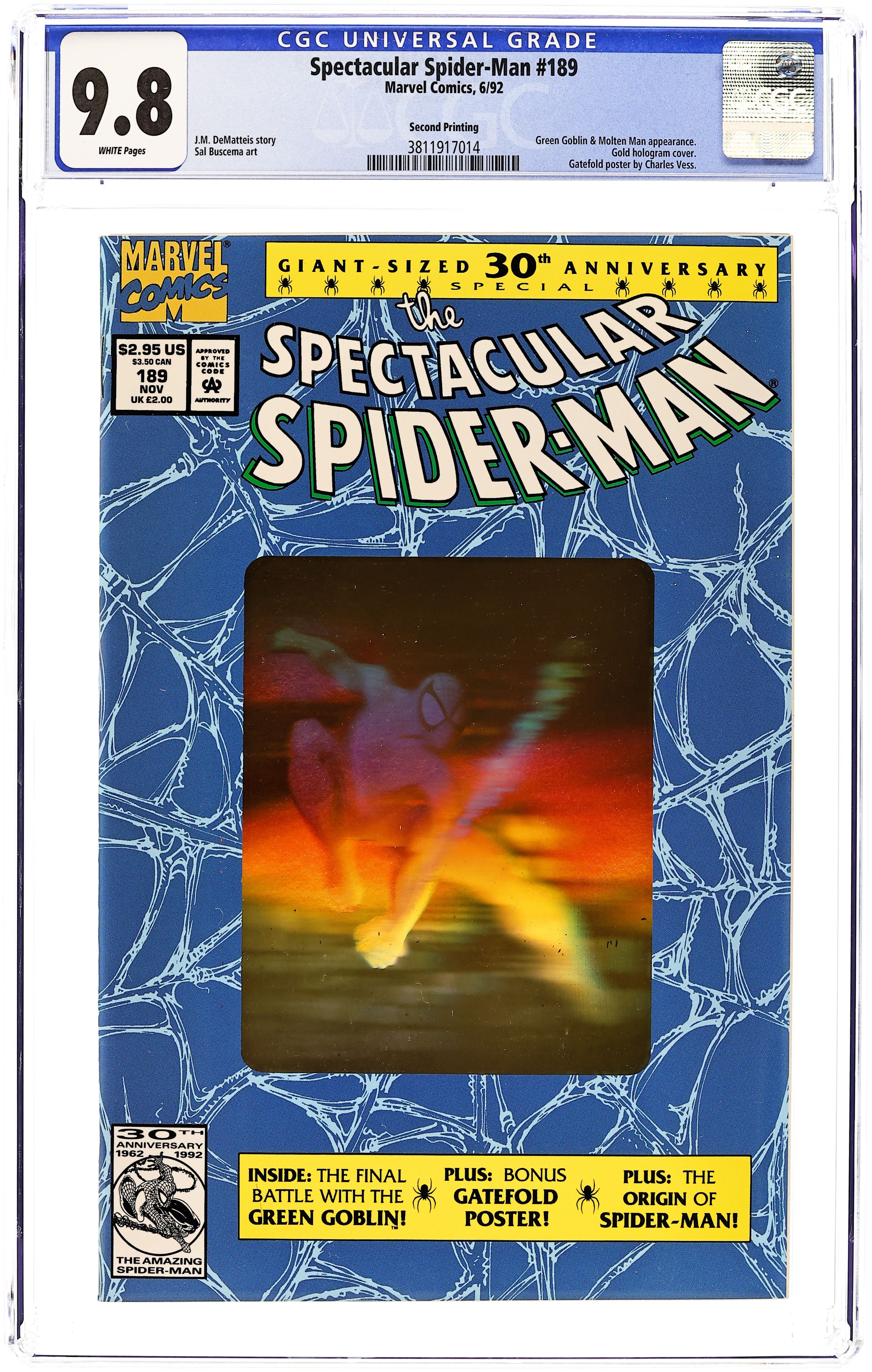 Starts Apr 4 Second printing. Direct Edition. Second Printing with gold cover hologram. The Osborn Legacy" Giant-Sized 30th Anniversary Special Issue. Script by J.M. DeMatteis. Pencils and Inks by Sal Buscema. Harry Osborn has battled psychological problems his entire adult life, but this time he's really gone off the deep end! The Green Goblin kidnaps his wife, son, and brother-in-law (aka the Molten Man) and takes the trio to his fathers old house in the suburbs. For the first time Harry wears the goblin costume in front of his young son. However, Normie doesn't seems to understand the gravity or depravity of the situation and enjoys his fathers ranting and raving while the family sits down for dinner! Fortunately, the goblins diatribe buys the web-slinger time to track down his green and purple foe! And with help from the Molten Man, the Amazing Spider-Man battles the Green Goblin one more time! Second Story: The Night the World Died Script by J.M. DeMatteis. Pencils and Inks by Bob McLeod. Aunt May still has nightmares about the night her husband, Ben Parker, was killed. But her recent encounter with Spider-Man (during the ordeal with the Vulture) has surprisingly brought her comfort. 48 pages Cover price $2.95.