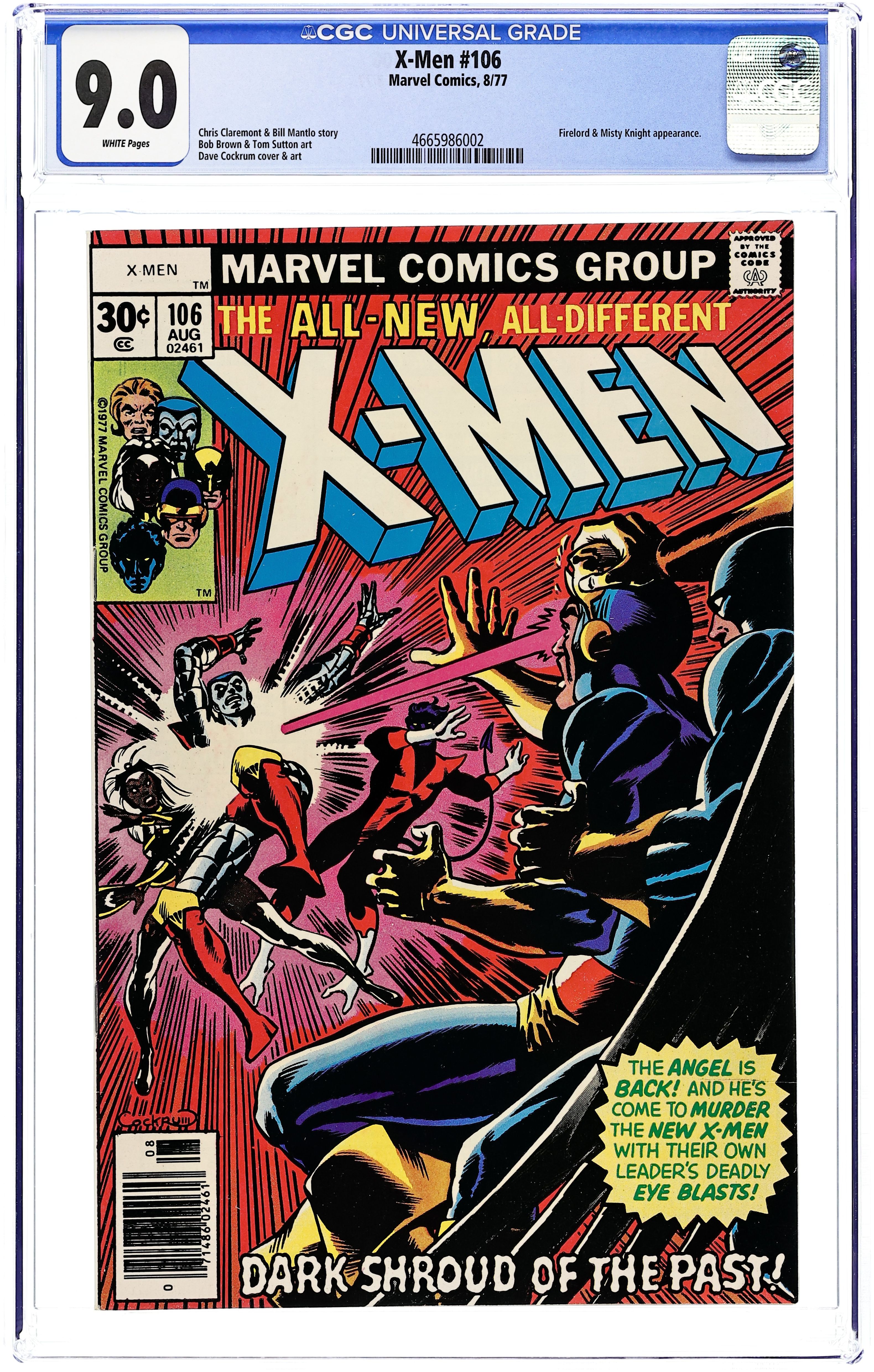 Starts Dec 22 Cover by Dave Cockrum. Dark Shroud of the Past!, script by Chris Claremont and Bill Mantlo, art by Dave Cockrum, Bob Brown, and Tom Sutton; The X-Men are working out in the Danger Room when the evil aspect of Xavier's mind attacks them with versions of the old X-Men. A fill-in issue that Classic X-Men skipped for reprinting. The story that began in Uncanny X-Men #105 continues in Uncanny X-Men #107. Short eulogy of Bob Brown. 36 pgs., full color. $0.30. Cover price $0.30.