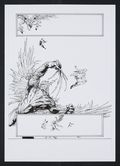 Trapped in a literal fog of war, two human soldiers initiate a last-ditch plan to disguise one of themselves as an alien soldier. Just as the procedure is complete, Jenny is mistaken for one of the aliens and learns some harsh truths about what kind of war she's been fighting. Beautiful, emotive creature design and a grimly gorgeous fourth panel make this a fantastic sci-fi page. Signed by Hampton in lower margin. Pencil and ink on art board. 11" x 16 1/2".