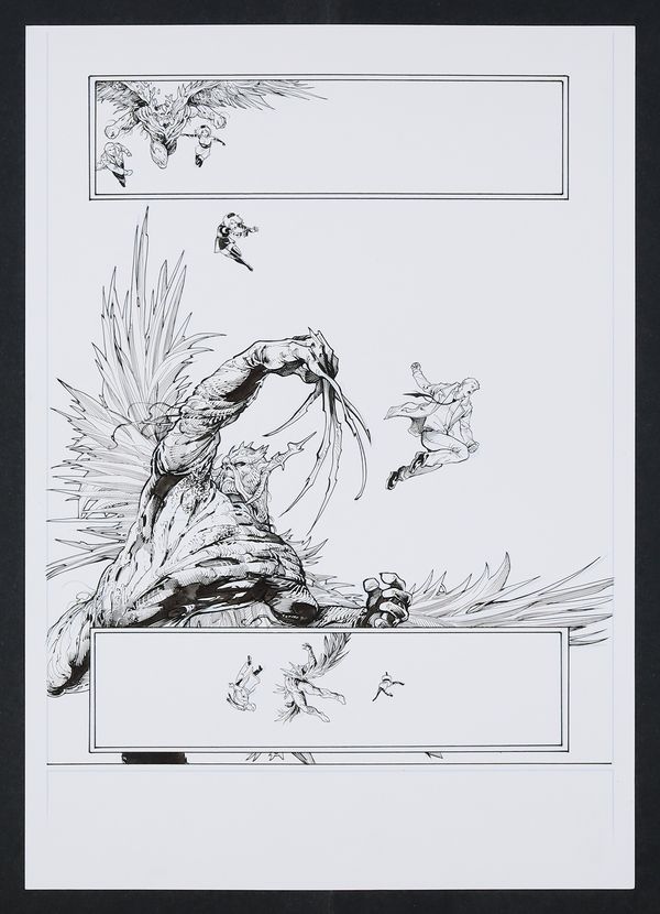 A powerful splash page from the climactic issue of this miniseries which saw Aquaman leading a resistance against an invasion of Atlantis perpetrated by giant, genocidal jellyfish! As the Atlantean forces make a last ditch charge to break the siege on Poseidonis, they find themselves aided by a massive army of sea life which is revealed here to be commanded by Aquaman. Swan and Vey do a tremendous job depicting the vast effort expended by the King of Atlantis here, perched atop one of the city's tallest buildings! Pencil and ink on DC Comics art board. 16 3/4" x 11 1/4".