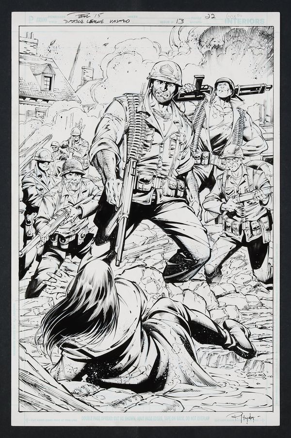 A great last page splash showcasing DC's finest fightin' force- Sgt. Rock and Easy Company (with The Unknown Soldier in the background) standing over a downed Vandal Savage! A big, powerful page from this time-travelling story. Signed by Pelletier in top margin and Hunter in lower margin. Pencil and ink on DC Comics art board. 11" x 17".