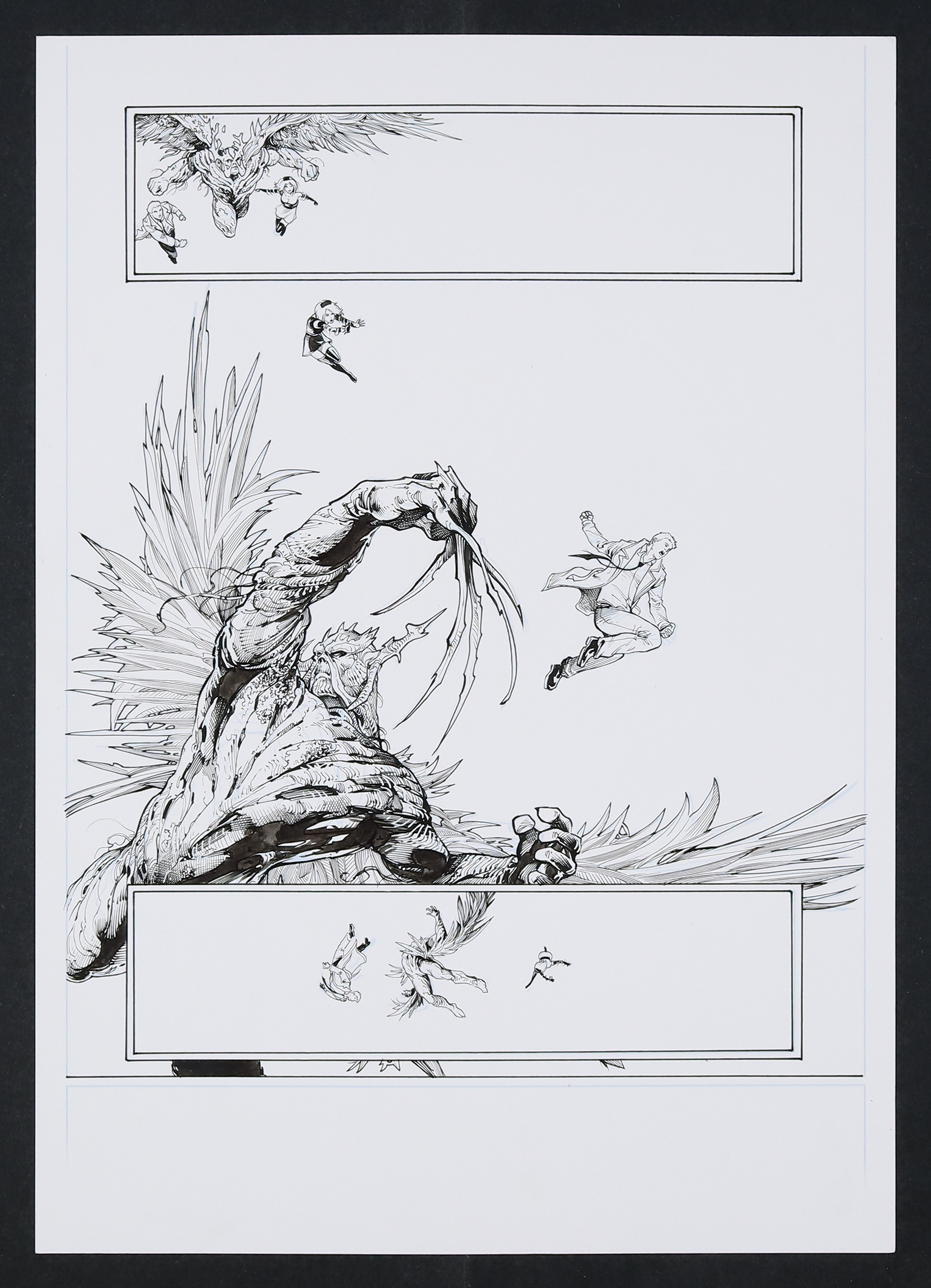 In the midst of the Forever Evil event when most of DC's heroes fought the Crime Syndicate, the Justice League Dark was fighting the literal manifestation of evil itself! Here we see Swamp Thing, Nightmare Nurse, and John Constantine leaping into battle against the primal being...and quickly being tossed aside. Beautiful work from Cifuentes here in the detail on Swampy's battle form and on the very tiny figure of Nightmare Nurse! Ink over printed pencils on art board. 11 3/4" x 16 1/2".