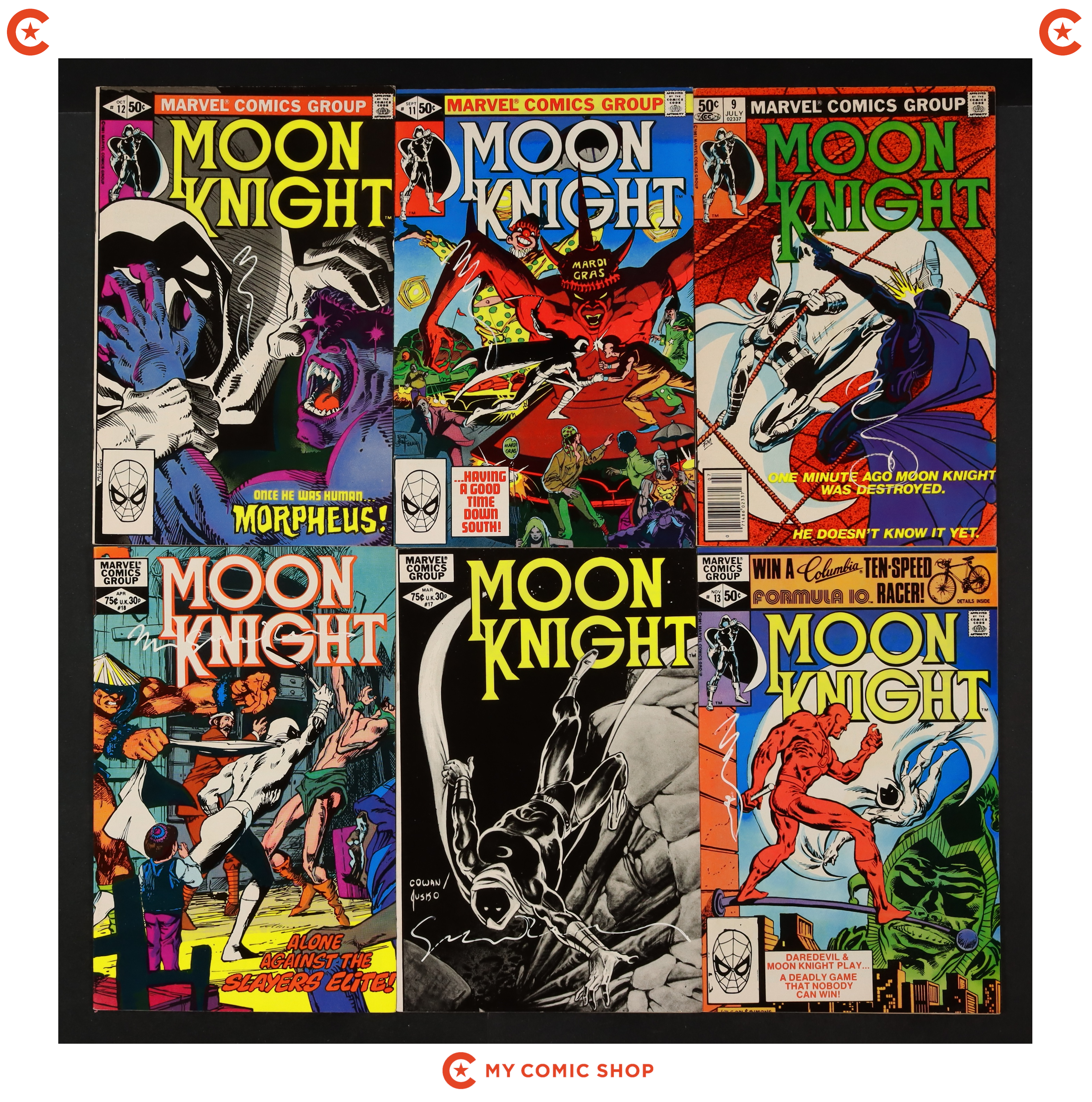 Issue 28UK, 29 of Marvel Spotlight (1971 1st Series), issue 1 of Marc Spector Moon Knight (1989), issue 1N of Moon Knight (1980 1st Series). Most will grade in the VG to FN range.