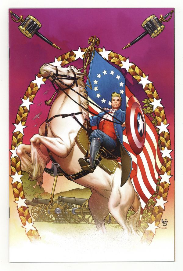 Starts Mar 2 Limited 1 for 100 Retailer Incentive Variant Cover. (W) J. Michael Straczynski (A) Ron Lim; SEAN DAMIEN HILL (CA) Paulo Siqueira REVOLUTIONARY WARRIORS, ASSEMBLE! Calamity strikes when a mysterious force dares to tamper with the sacred threads of history. CAPTAIN AMERICA and his formidable squad of Marvel heroes leap into action! Their mission? To safeguard the founding of the United States of America! The fate of the nation hangs in the balance at the dawn of the Revolution, as these valiant heroes must navigate the treacherous waters of the past to ensure a future that remains untarnished. Cover price $4.99.