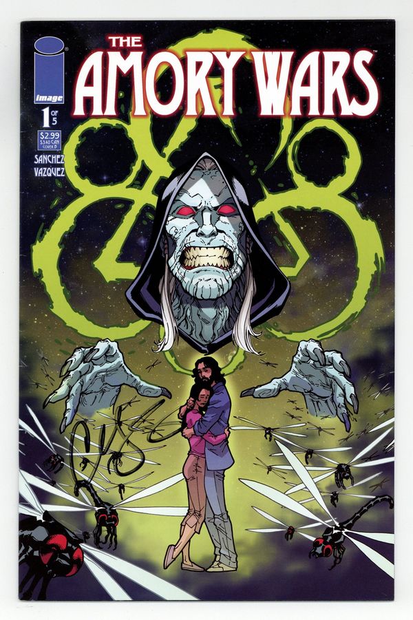 Starts Apr 4 Variant cover. Coheed Kilgannon's suburban world is turned upside down by General Mayo Deftinwolf, who explains the nightmares of torture that violate Coheed's dreams are real-and that Coheed and his family play a crucial piece in a terrorist plot to destroy all the worlds of the Keywork. To save these worlds, Coheed and his wife, Cambria, must do the unthinkable... From the imagination of Claudio Sanchez, the creative mind behind the music sensation COHEED AND CAMBRIA, comes a science fiction epic in the tradition of Star Wars and The Matrix-a new, star-spanning mythology, rooted in the story of one simple family. Hold on tight. The Amory Wars start here! Cover price $2.99.