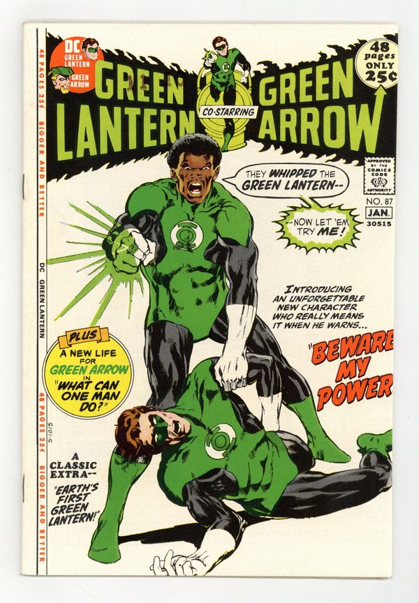 Starts Apr 4 Giant-size issue. Cover by Neal Adams. First appearance of John Stewart in Beware My Power, script by Denny O'Neil, pencils by Neal Adams, inks by Dick Giordano; When Guy Gardner is injured, the Guardians of the Universe instruct Hal Jordan to train another back-up, but John Stewart has different ideas about how to be a Lantern; When an attempt is seemingly made on the life of racist politician Jeremiah Clutcher, John Stewart figures out that the attack was faked and part of a cynical plot to get Clutcher elected president. What Can One Man Do?, script by Elliot Maggin, pencils by Neal Adams, inks by Dick Giordano; After Green Arrow witnesses the death of a young boy in a riot, he decides that he might be able to do more for his city as its mayor. Reprint back-up story: Earth's First Green Lantern!, (from Green Lantern 16), script by Gardner Fox, pencils by Gil Kane, inks by Murphy Anderson; Hal Jordan explains to Pieface why Abin Sur came to Earth in a spaceship when all Green Lanterns can travel thru space unaided. The Flash ad. 52 pgs., full color. $0.25. Cover price $0.25.