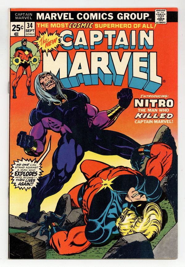 Starts Mar 23 First appearance of Nitro in "Blown Away!" Script by Steve Englehart, plot and pencils by Jim Starlin (final full issue), inks by Jack Abel. Appearances by Carl Danvers and Rick Jones. Cameos by Moon Dragon, Drax the Destroyer, and Iron Man. PLUS, the events of this issue directly lead to the cancer that eventually takes Marvel's life in the classic "Death of Captain Marvel" Graphic Novel. The letters page contains Marvel Value Stamp series A # 25 (the [Human] Torch). Starlin cover. Cover price $0.25.