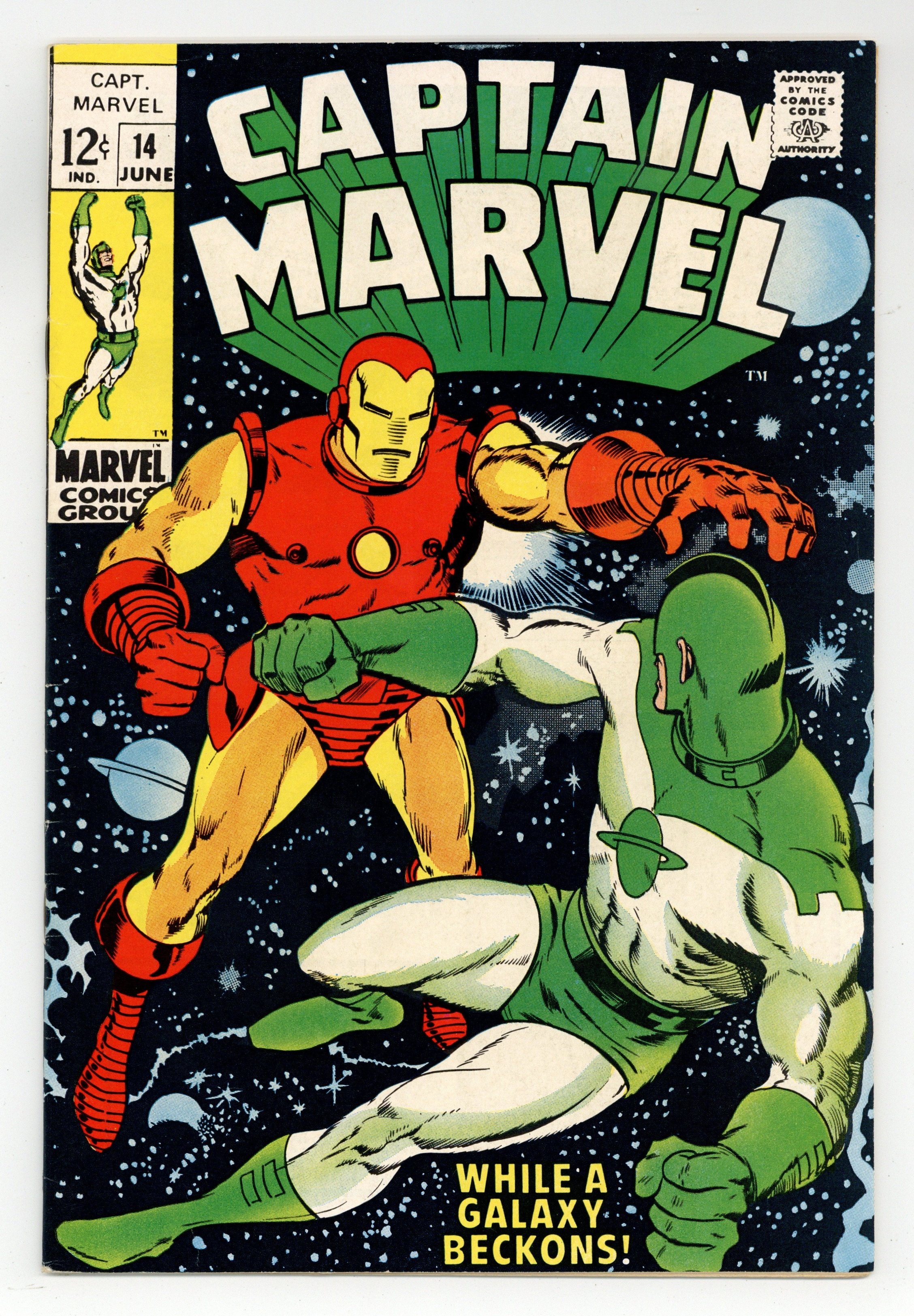 Starts Mar 23 Cover pencils by Jim Starlin, inks by Joe Sinnott. Captain Marvel battles the Super-Skrull (in the guise of Ronan, Megaton, Yon-Rogg, the Hulk, and the Sub-Mariner) in "A Taste of Madness!", script by Mike Friedrich, pencils by Jim Starlin (first work on the series), inks by Chic Stone; In an elaborate scheme of the Skrulls and their mysterious Masterlord, Super-Skrull and Kl'rt, Rick Jones is framed for the murder of Dr. Benjamin Savannah and brought to a run-down police precinct; Using Super-Skrulls invisibility as well as other Skrull technology, Mar-Vell and Rick are led to believe that many of his long-time friends and foes have returned and are attacking him; Rick and Mar-Vell identify the ruse, and Mar-Vell attacks the Skrulls; The building collapses in the battle and the Skrulls escape. 36 pgs., full color. Cover price $0.20.