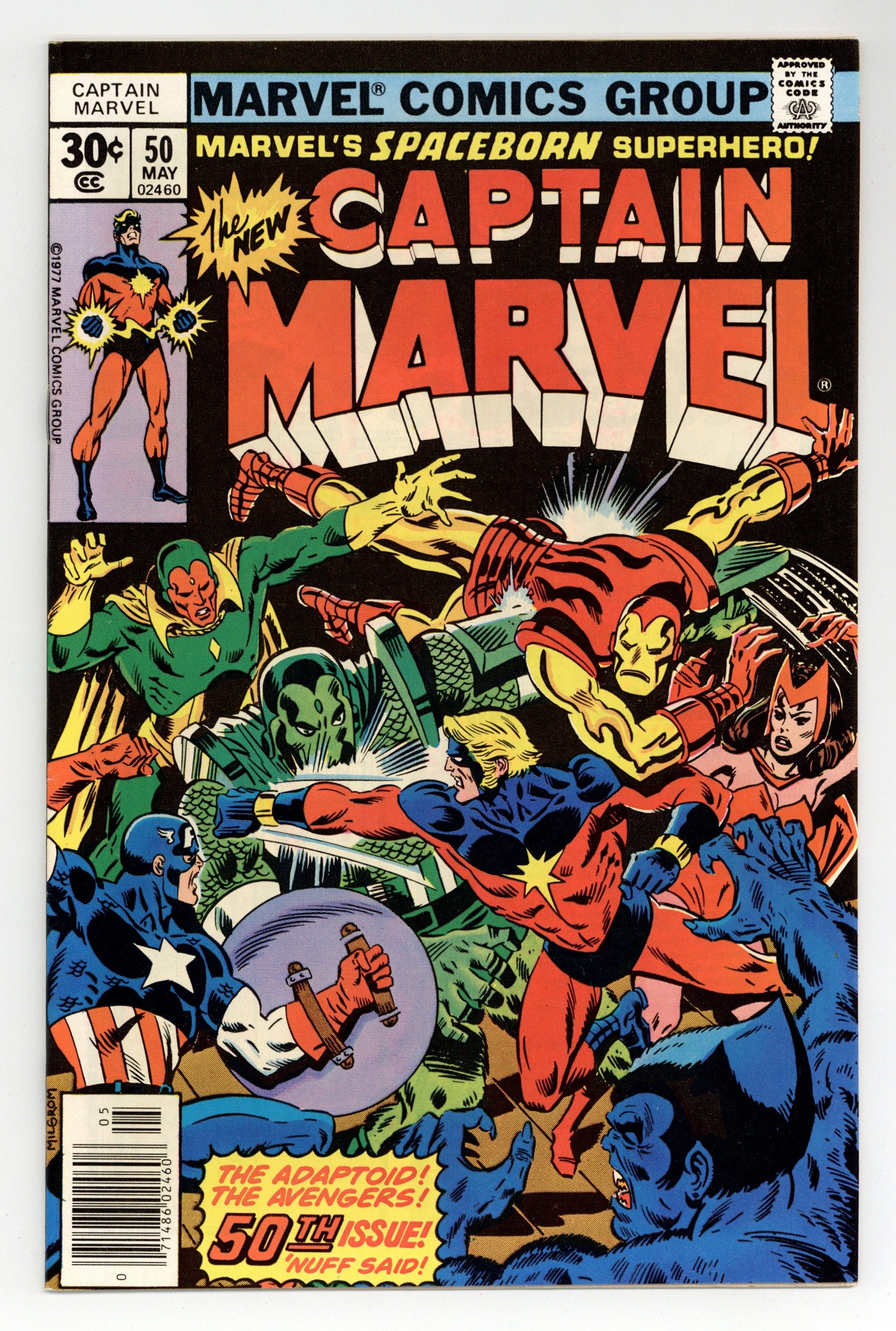 Starts Mar 23 Captain Marvel battles Thanos in "The God Himself!" Script by Steve Englehart, plot and pencils by Jim Starlin, inks by Klaus Janson. Guest starring Drax the Destroyer. Brief appearance by the Avengers (Thor, Iron Man, the Vision, the Swordsman, Captain America, the Black Panther, and the Scarlet Witch). The letters page contains Marvel Value Stamp series A # 6 (Thor by John Buscema). Starlin cover. Cover price $0.25.