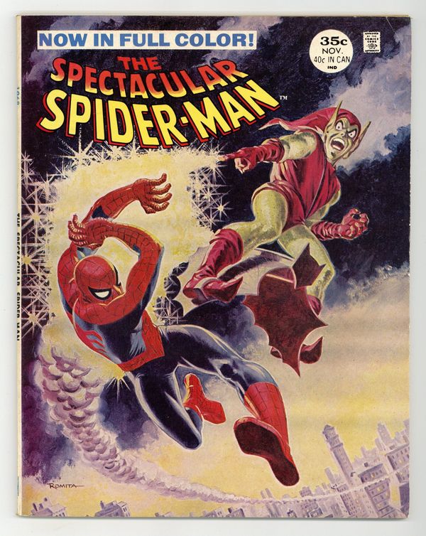 Ends Dec 15 9:28 PM CST Bid History 3 bids Current Bid $34 Your Secret Max Bid If you'd like to bid, please log in or register. "Twice Stings The Tarantula!" Part 1 of 3. Script by Gerry Conway. Pencils by Sal Buscema. Inks by Mike Esposito. Cover by Sal Buscema and John Romita. The first issue of a brand new series for Spider-Man! The story opens with a bang as the Tarantula kidnaps the Empire State University vice-chancellor, despite the best efforts of the web-slinger, Flash Thompson, and Mary Jane Watson! Next, the Tarantula tries to kill the mayor, but this time the Spectacular Spider-Man is ready! Can the wall-crawler beat the Tarantula and save Mayor Abe Beame? First appearance of Edward Lansky (aka Lightmaster). (Notes: The Spectacular Spider-Man series became the third monthly title for Spider-Man. The first issue of the series debuted the same month as Amazing Spider-Man 163 and Marvel Team-Up 52. The letters page contains an essay from Gerry Conway describing the plans for the new Spider-Man title.) 32 pages Cover price $0.30.