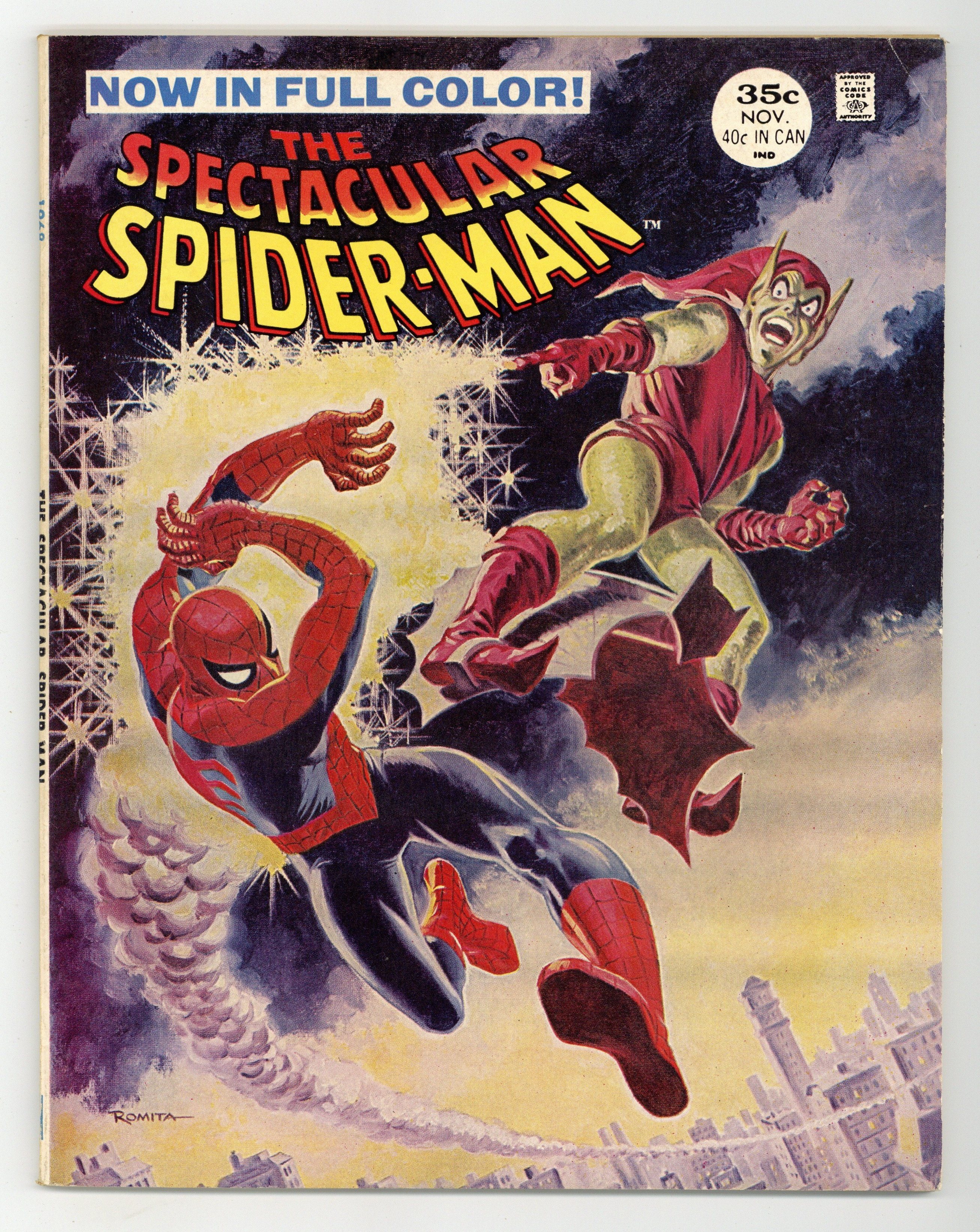 Starts Dec 22 "Twice Stings The Tarantula!" Part 1 of 3. Script by Gerry Conway. Pencils by Sal Buscema. Inks by Mike Esposito. Cover by Sal Buscema and John Romita. The first issue of a brand new series for Spider-Man! The story opens with a bang as the Tarantula kidnaps the Empire State University vice-chancellor, despite the best efforts of the web-slinger, Flash Thompson, and Mary Jane Watson! Next, the Tarantula tries to kill the mayor, but this time the Spectacular Spider-Man is ready! Can the wall-crawler beat the Tarantula and save Mayor Abe Beame? First appearance of Edward Lansky (aka Lightmaster). (Notes: The Spectacular Spider-Man series became the third monthly title for Spider-Man. The first issue of the series debuted the same month as Amazing Spider-Man 163 and Marvel Team-Up 52. The letters page contains an essay from Gerry Conway describing the plans for the new Spider-Man title.) 32 pages Cover price $0.30.