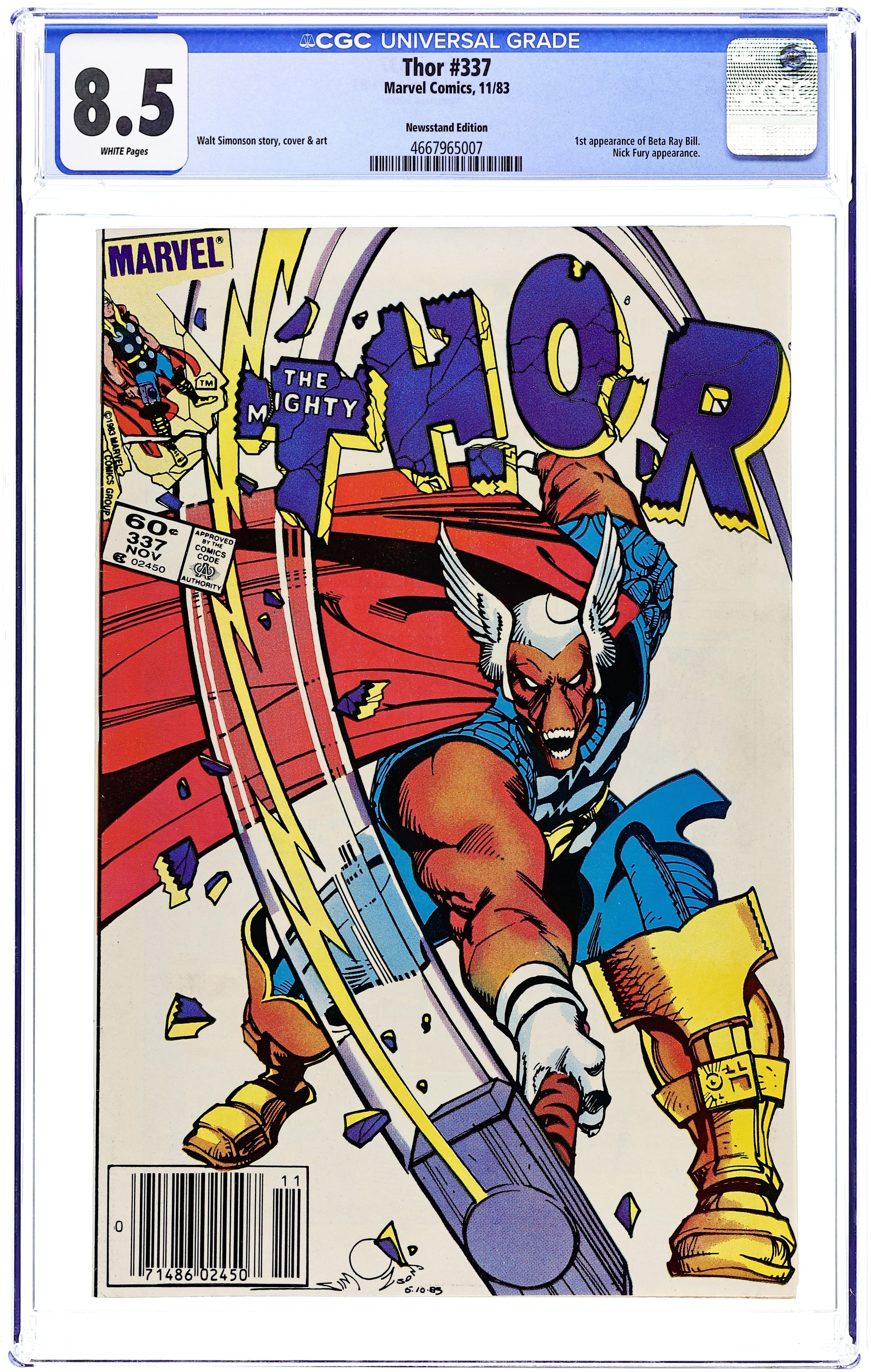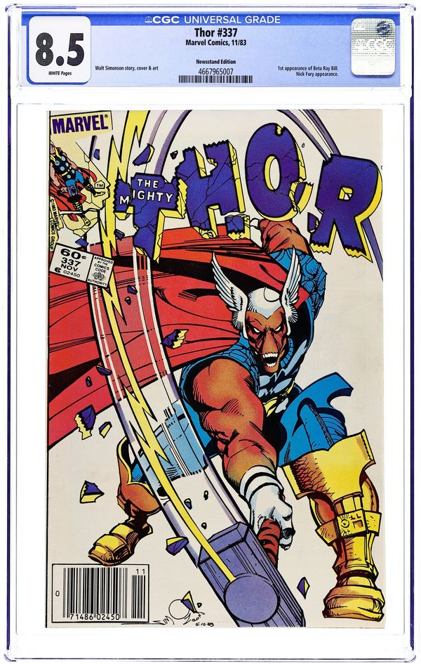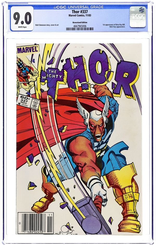 Ends Dec 29 9:35 PM CST Bid History no bids Minimum Bid $1 Your Secret Max Bid If you'd like to bid, please log in or register. Newsstand Edition. Cover by Walt Simonson. Beta Ray Bill (first appearance) becomes Thor in "Doom!", script and art by Walt Simonson; Nick Fury asks Thor's aid in investigating an alien ship heading for earth; Thor arrives and triggers the awakening of an alien protector, Beta Ray Bill; Bill bests Thor and takes up his hammer only to be accidentally summoned to Asgard by Odin who thinks he is summoning Thor. Brief appearances by Nick Fury, Loki, Sif, Balder, Heimdall, Volstagg, and Odin. First appearance of Lorelei (sister of the Enchantress). Begins Walt Simonson's run on Thor (through #382). Bullpen Bulletins. Star Frontiers TSR ad. 36 pgs., full color. $0.60. Cover price $0.60.