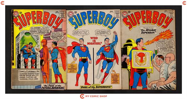 Ends Dec 15 9:38 PM CST Bid History 5 bids Current Bid $31 Your Secret Max Bid If you'd like to bid, please log in or register. Cover art by Curt Swan, inks by George Klein. Superboy Visits the 50th Century!, script by Otto Binder, pencils by Curt Swan, inks by John Forte; Superboy visits the 50th century where everyone considers him to be just a legend. Decoy of the Doom Statues!, script by Otto Binder, art by George Papp. Statement of ownership--average print run 952,000; average paid circulation 608,386. 36 Pages, Full Color. Cover price $0.12.