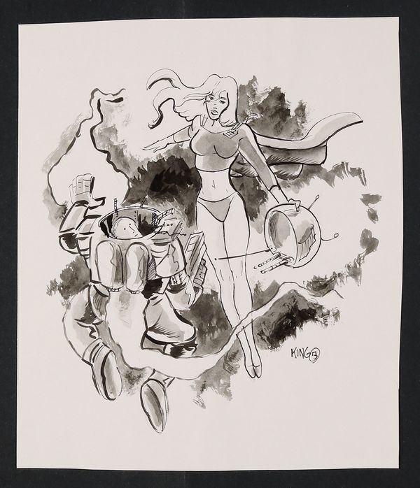 This Black and white depiction of the woman of tomorrow along with the villian she is defeating give her a much more science hero vibe as opposed to the typical bold and bright super-hero we all know. Pencil, ink, and watercolor on paper. Signed by the artist. 10 1/2" X 12 3/8".