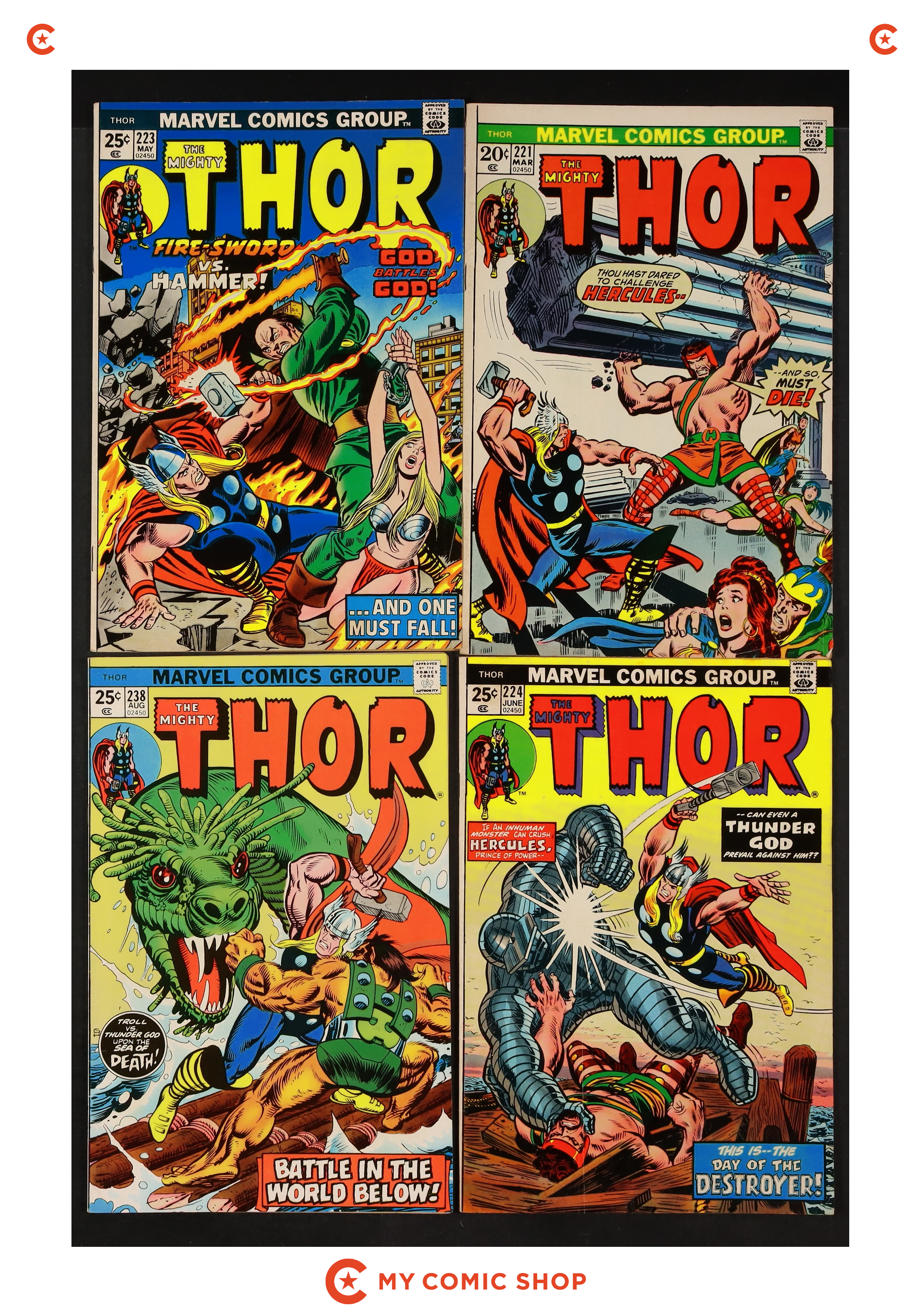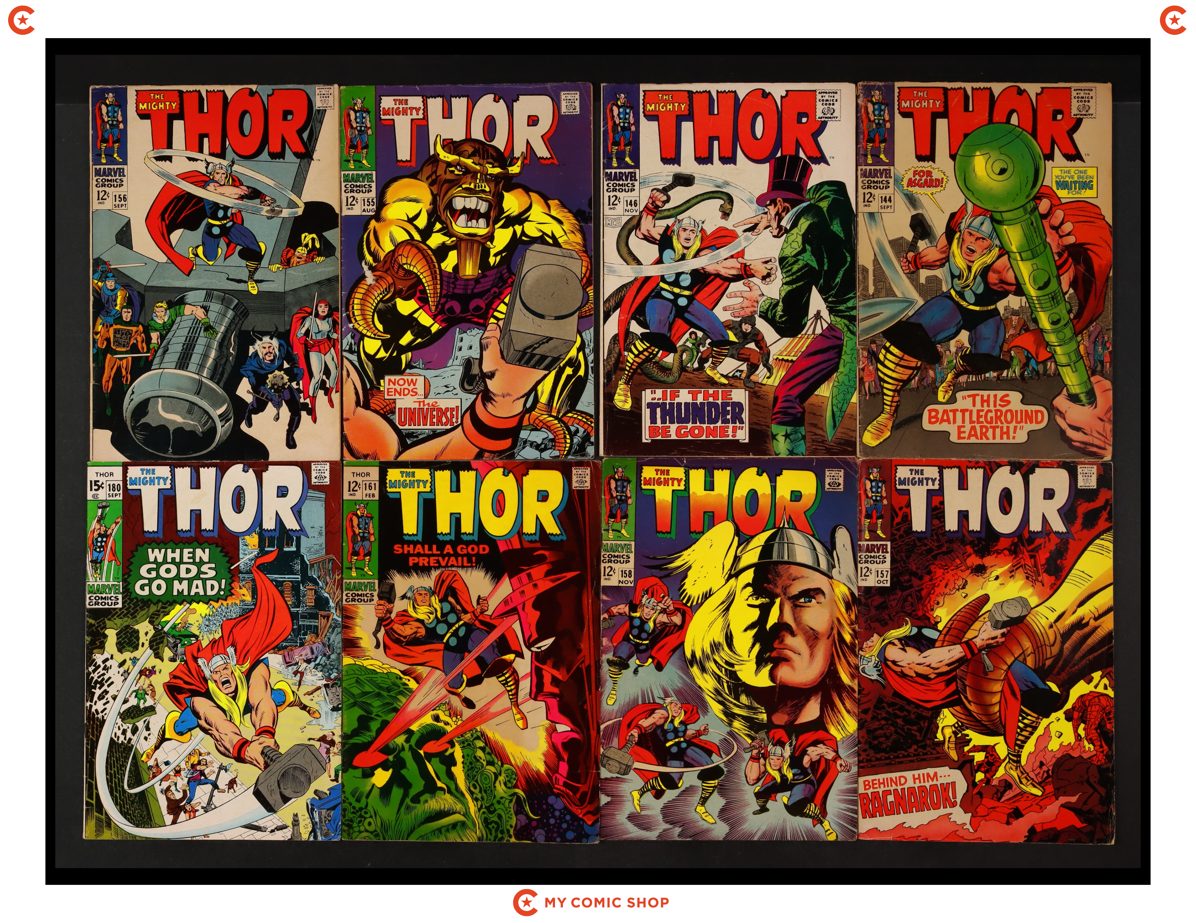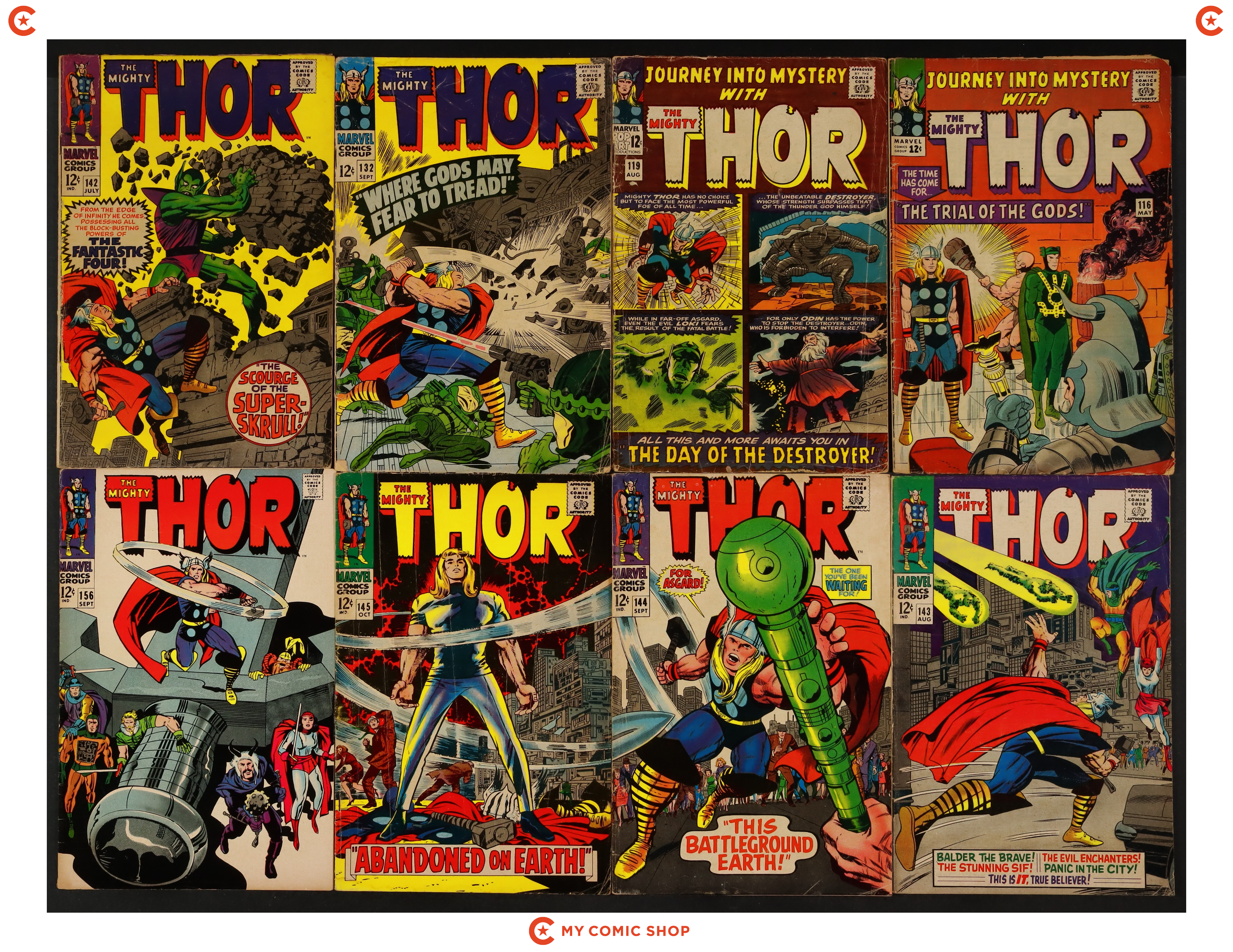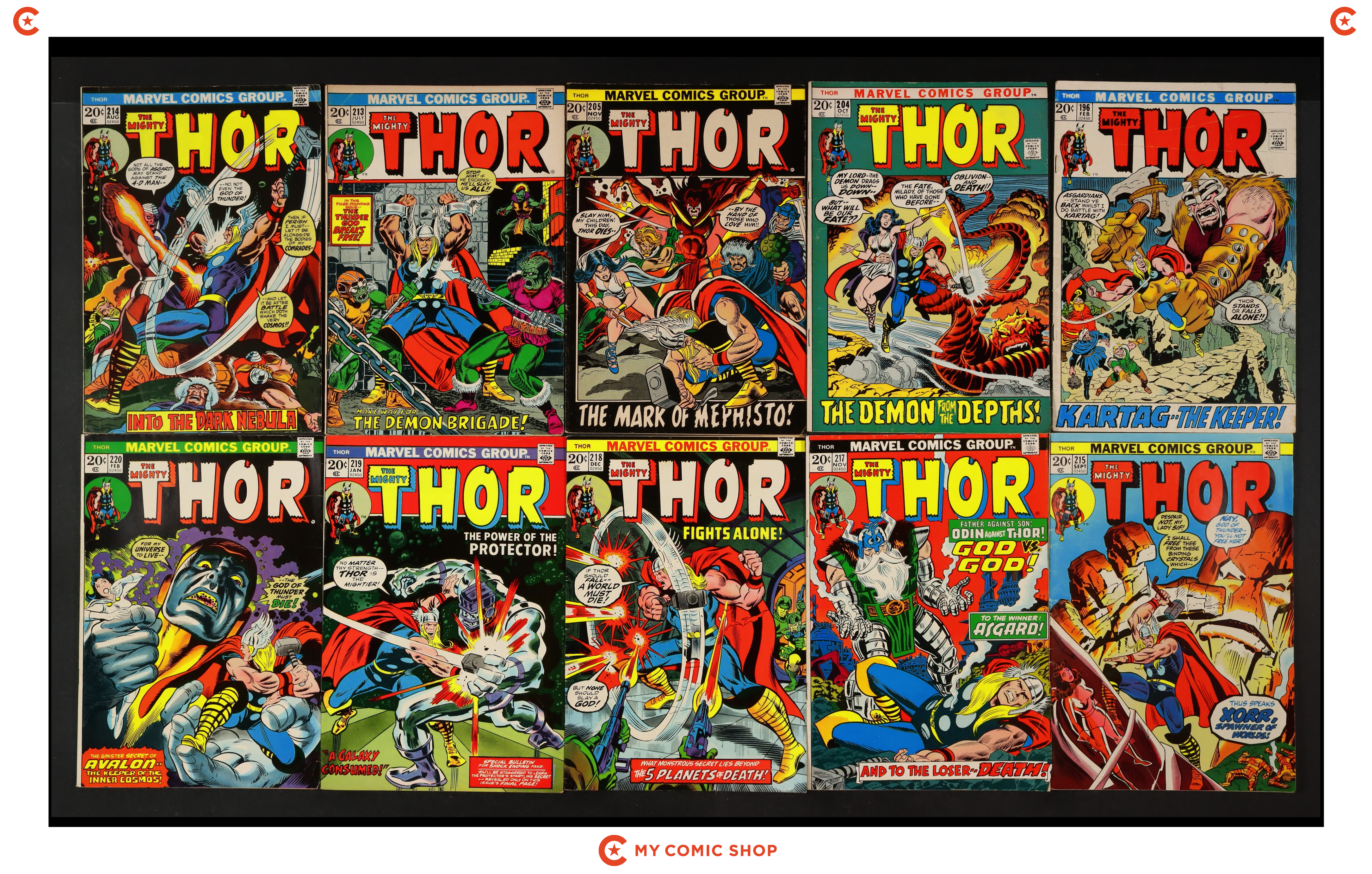 Issues 196, 204, 205, 213-215, 217-221, 223, 224, and 238 of Thor (1962 Marvel 1st Series Journey Into Mystery). Most will grade in the VG range with a few grading FN.