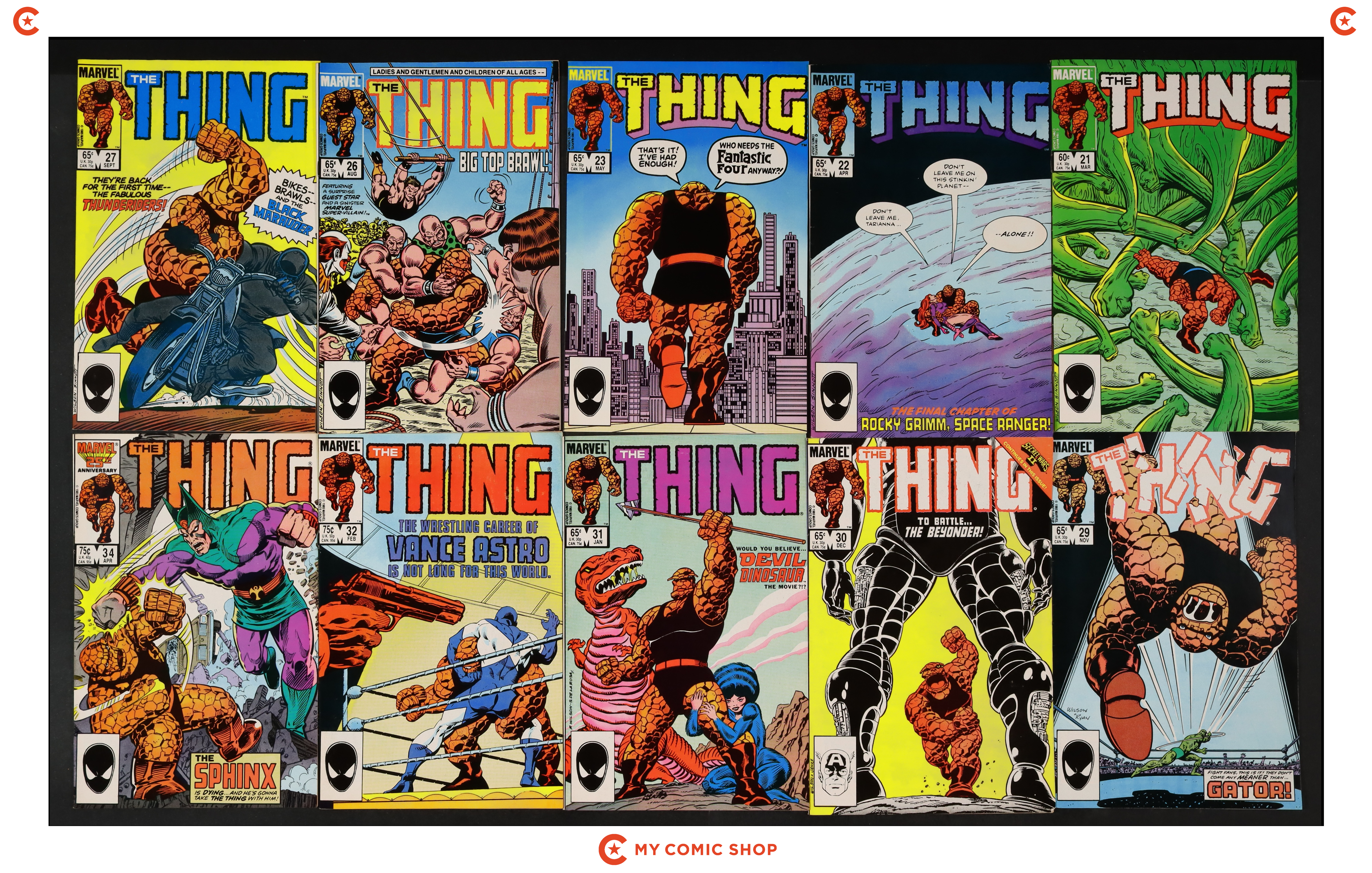 Issues 21-23, 26, 27, 29-32, and 34 of Thing (1983 1st Series Marvel). Most will grade in the VF to FN range.
