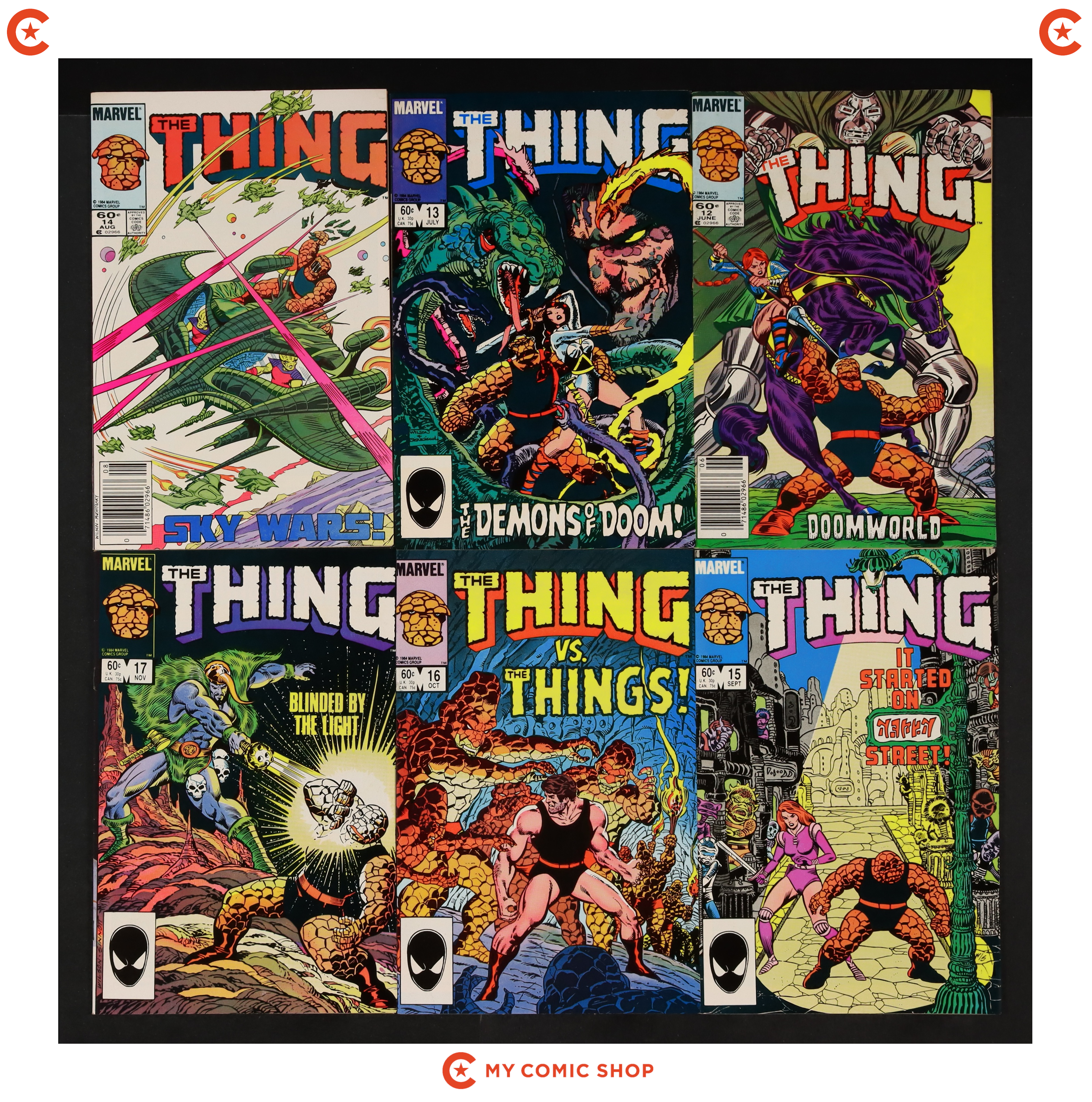 Issues 2, 3, 8, 11, 14-19 of Thing (1983 1st Series Marvel). Most will grade in the VG to FN range.