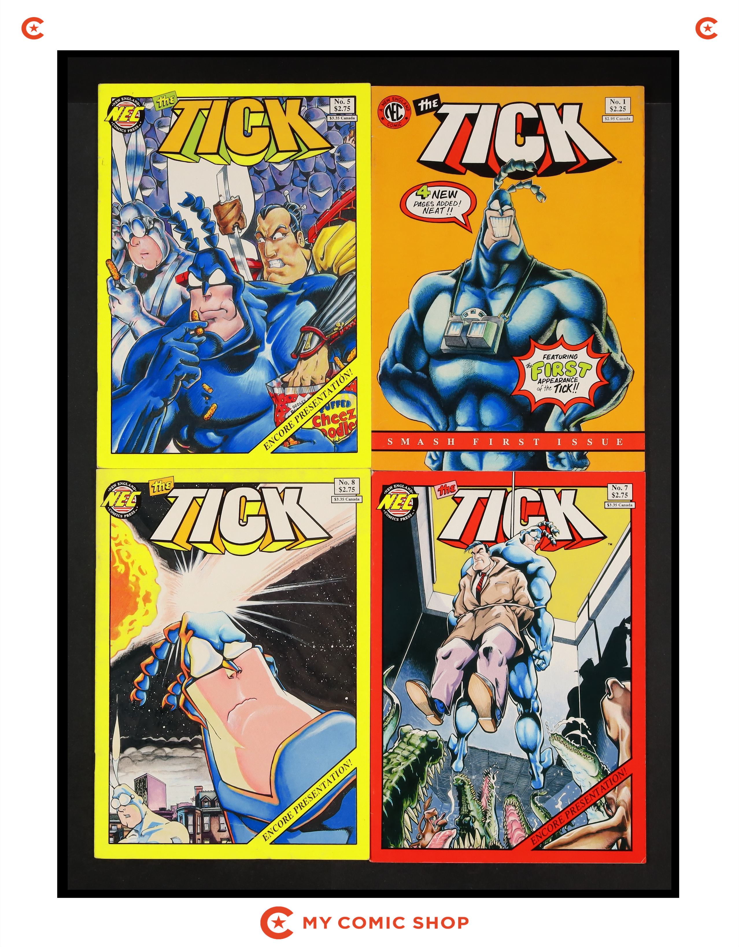 Issue 1 of Tick (1988) 4th Printing, issues 5, 7, 8 of Tick (1988) 2nd Printing. Most will grade in the VG to FN range.