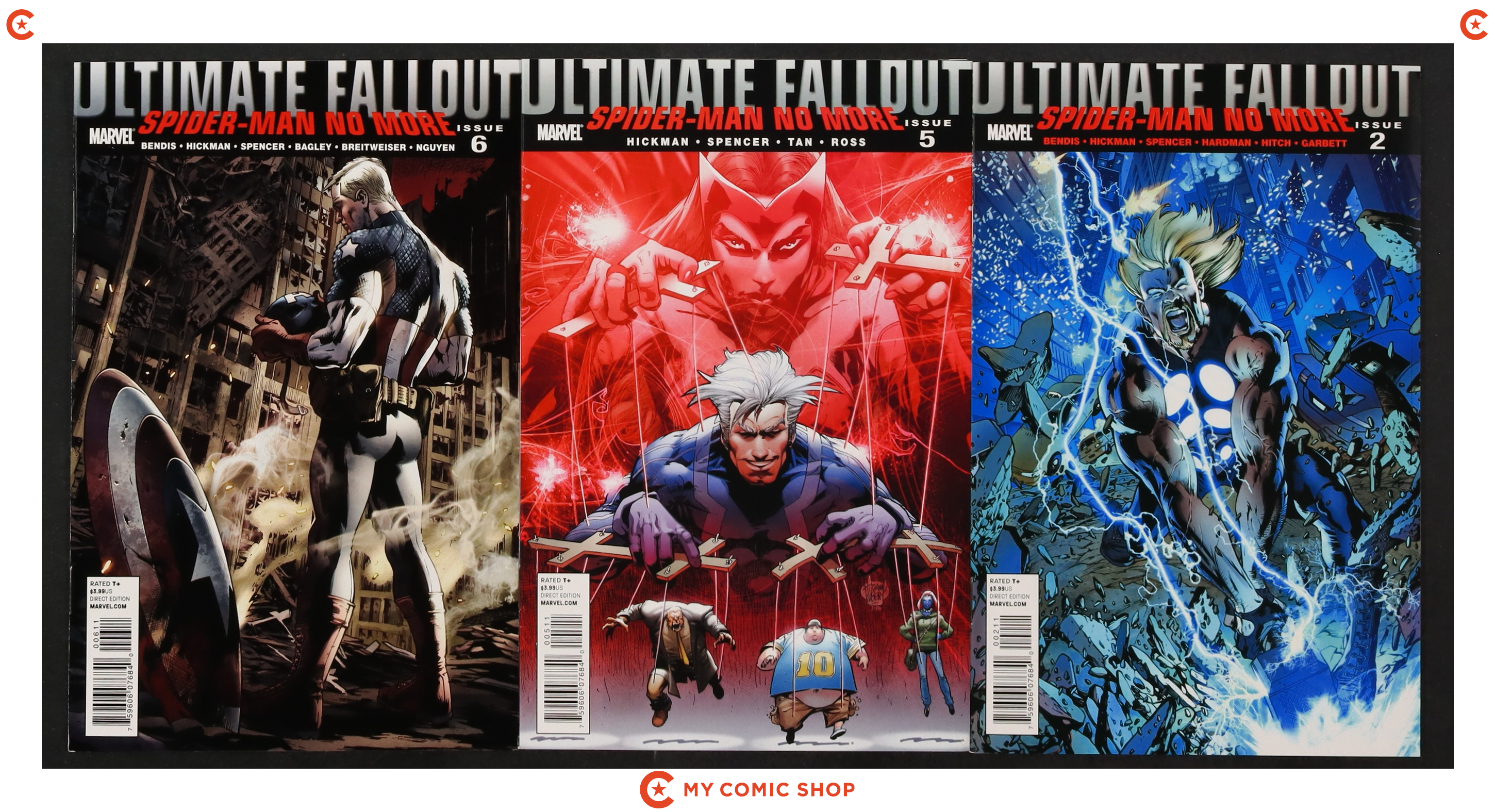 Ends Dec 15 9:52 PM CST Bid History 2 bids Current Bid $14 Your Secret Max Bid If you'd like to bid, please log in or register. 2nd Printing. Written by BRIAN BENDIS, JONATHAN HICKMAN & NICK SPENCER. Art by SARA PICHELLI, SALVADOR LARROCA & CLAYTON CRAIN. Cover by MARK BAGLEY. What will become of Captain America? Where have all the X-Men gone? And what is up with the new Spider-Man suit? Don't miss the final chapters of one of the most talked about Ultimate events ever. 32 PGS. (each)/Rated T+...$3.99 (each) Cover price $3.99.