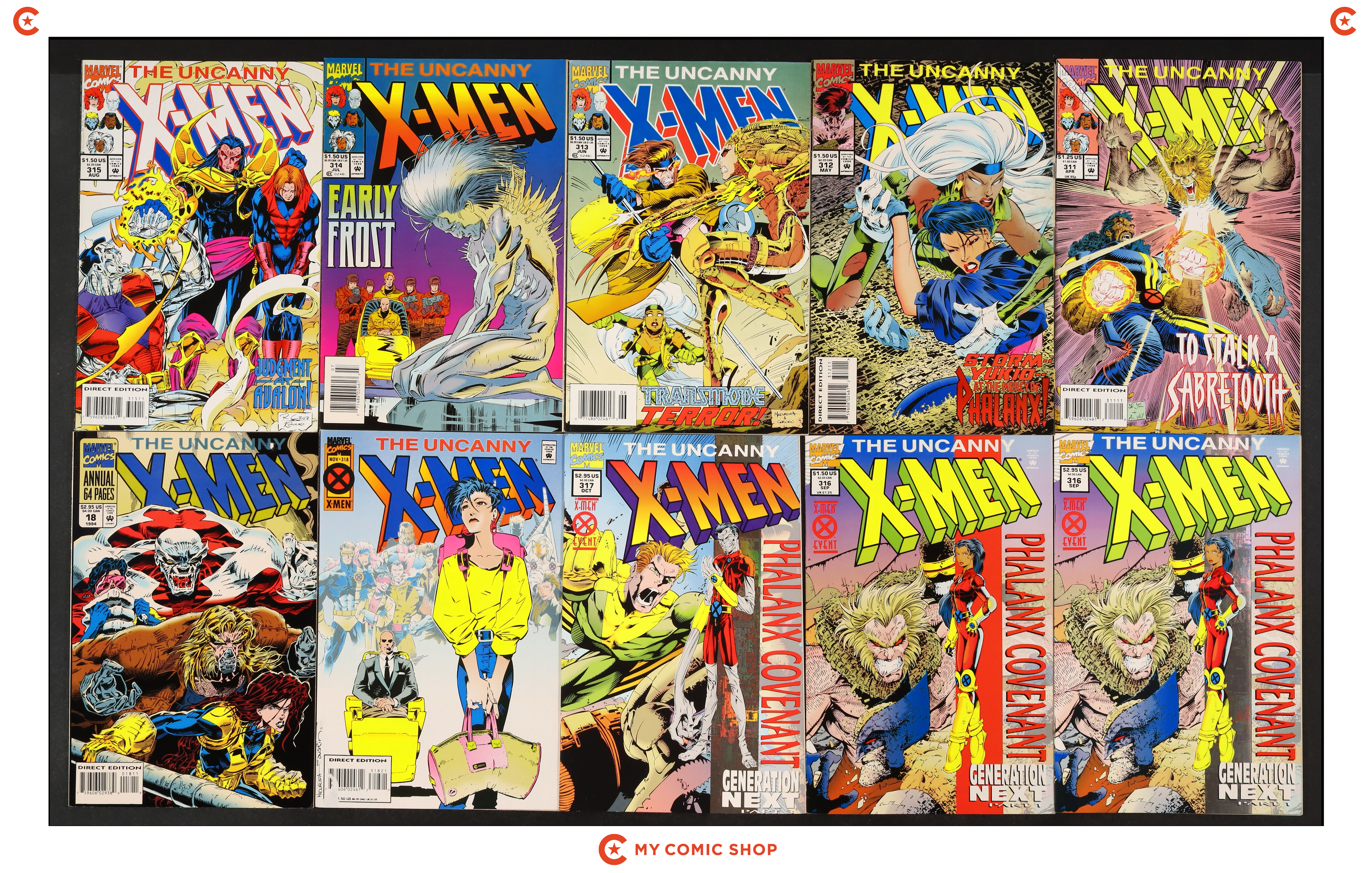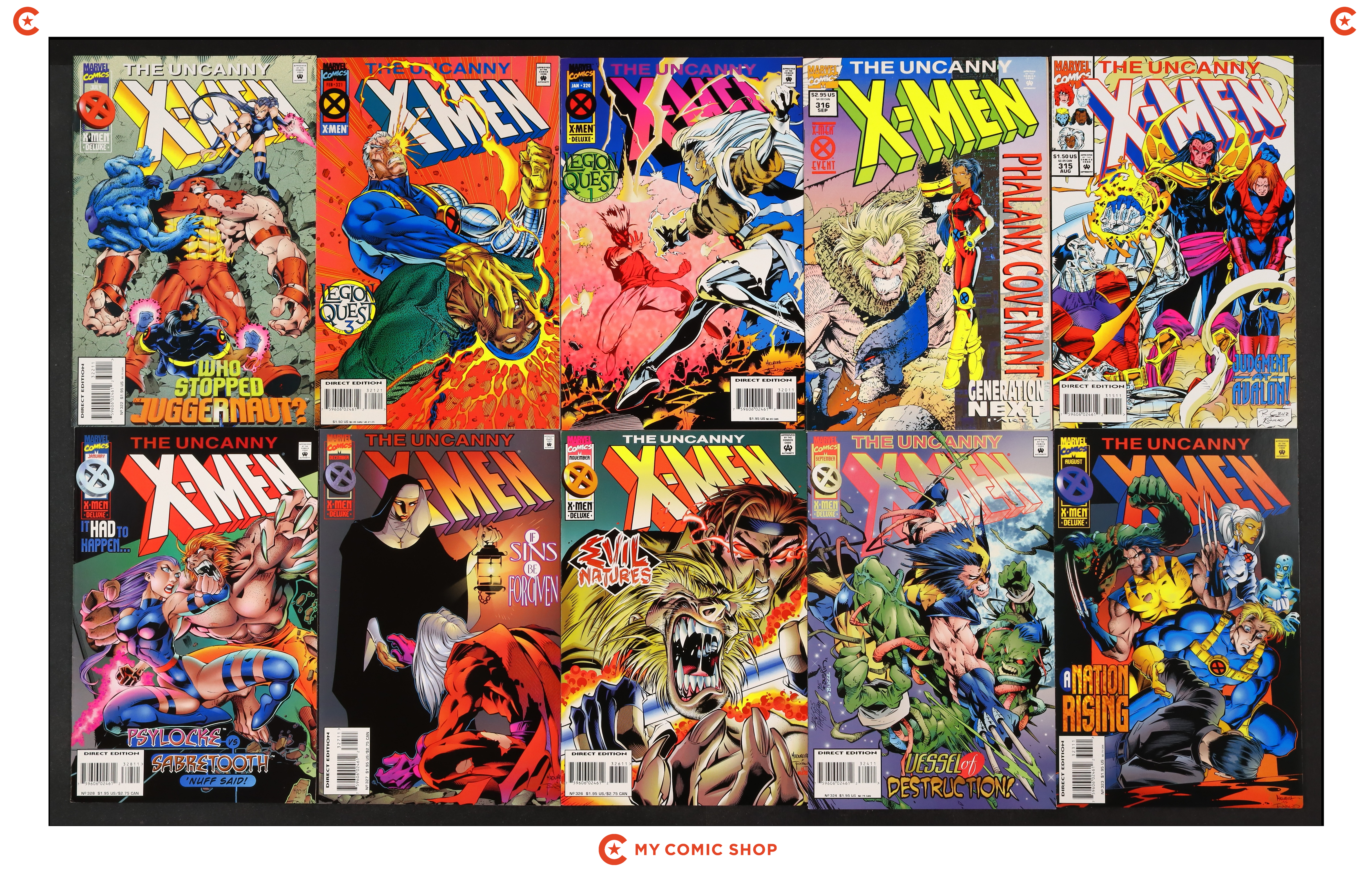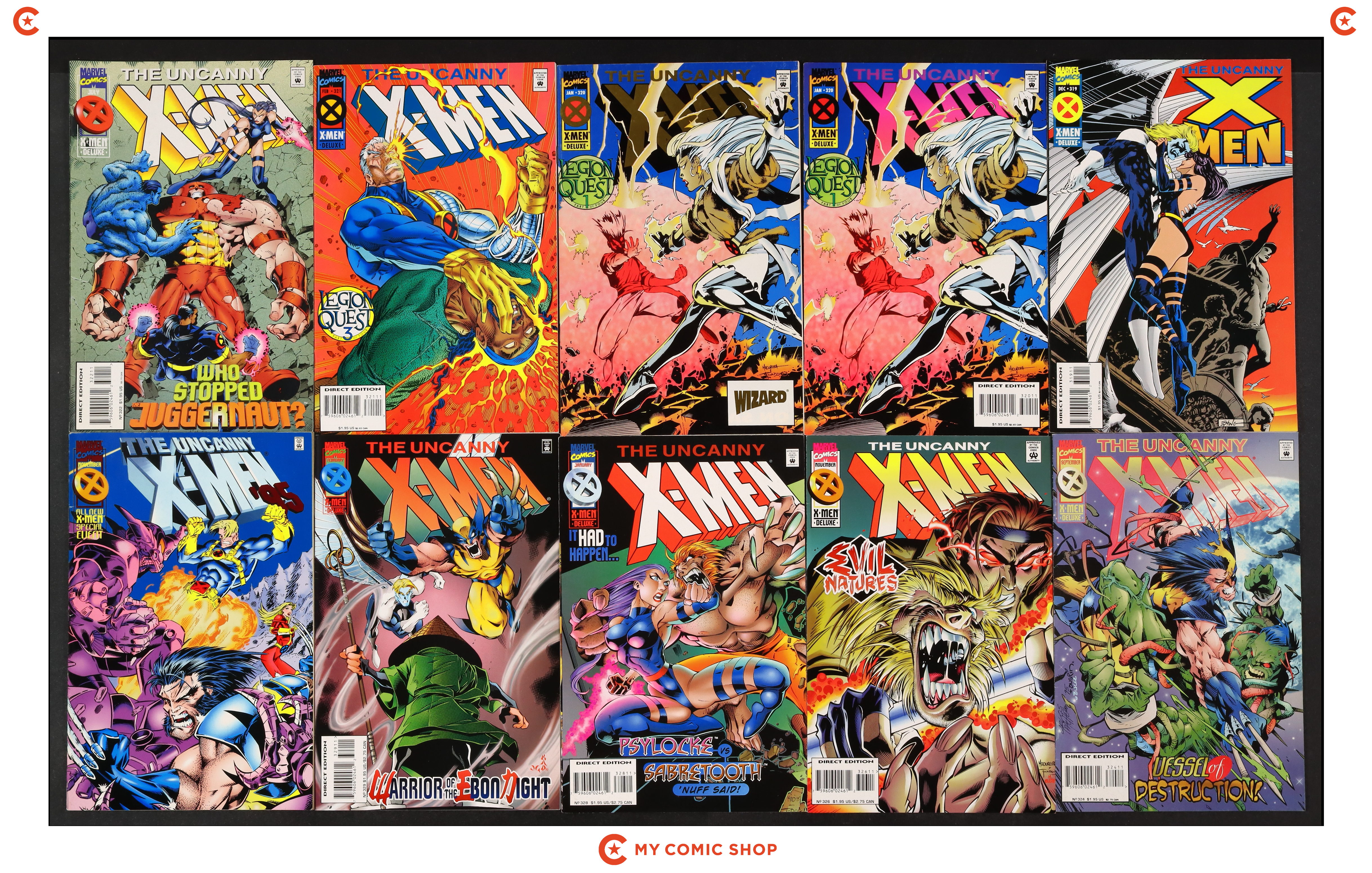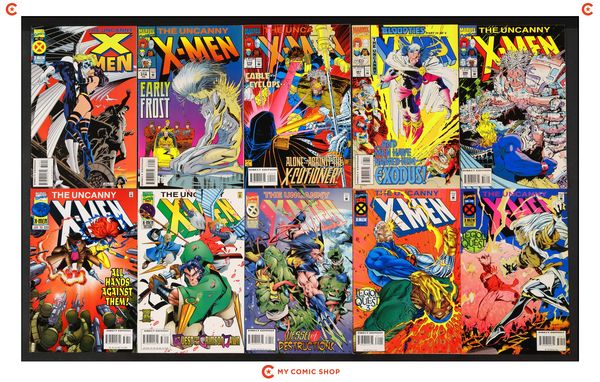 Issues 319A, 320A, 320WIZ, 321A, 322, 324, 326, 328, and 329 of Uncanny X-Men (1963 1st Series); and 1995 of Uncanny X-Men (1963 1st Series) Annual. Most will grade in the VF- to FN range.