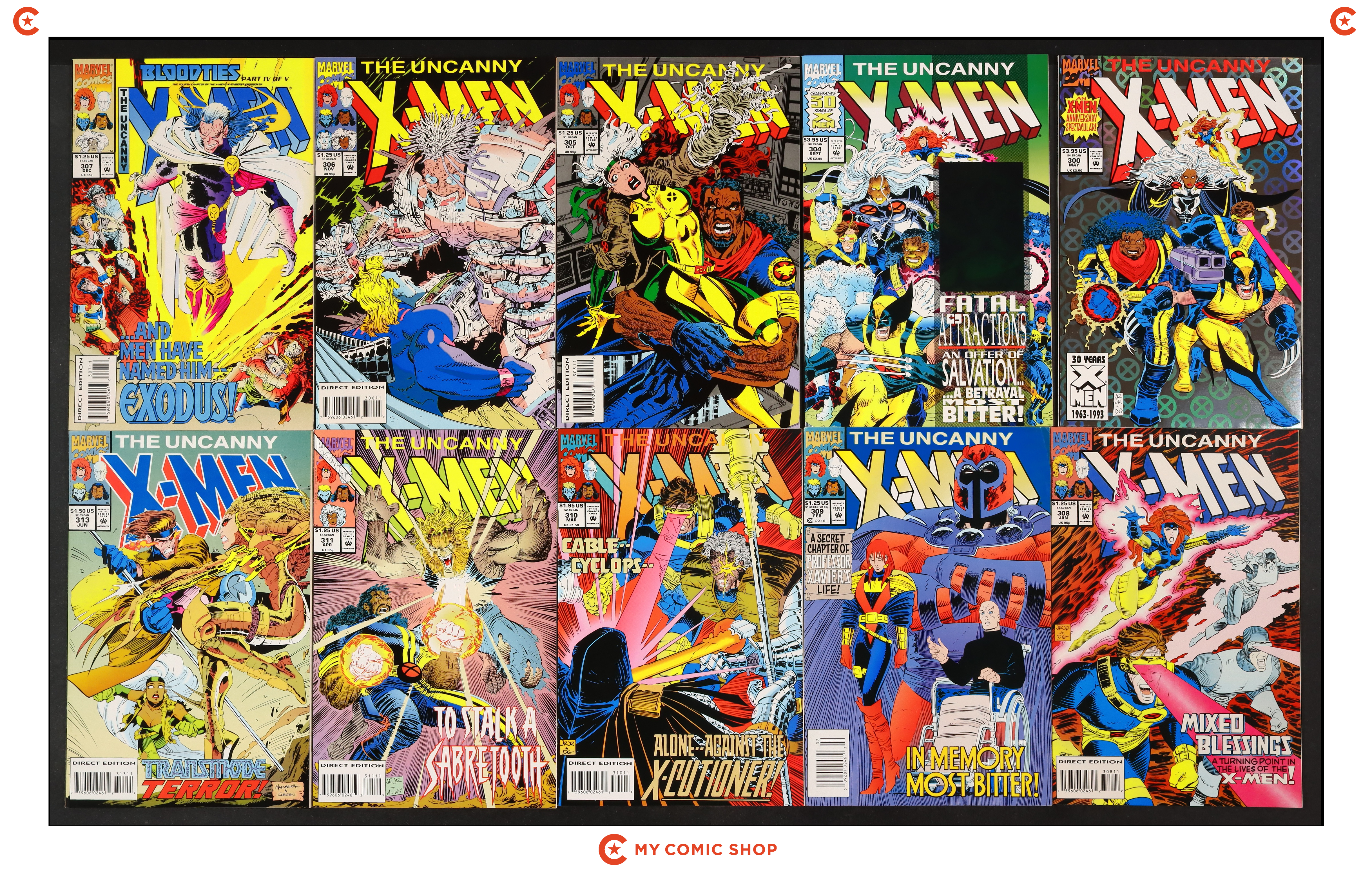 Issues 300D, 304D, 305D, 306D, 307A, 308, 309, 310, 311, and 313 of Uncanny X-Men (1963 1st Series). Most will grade in the VF to FN range with 309 grading VG+.