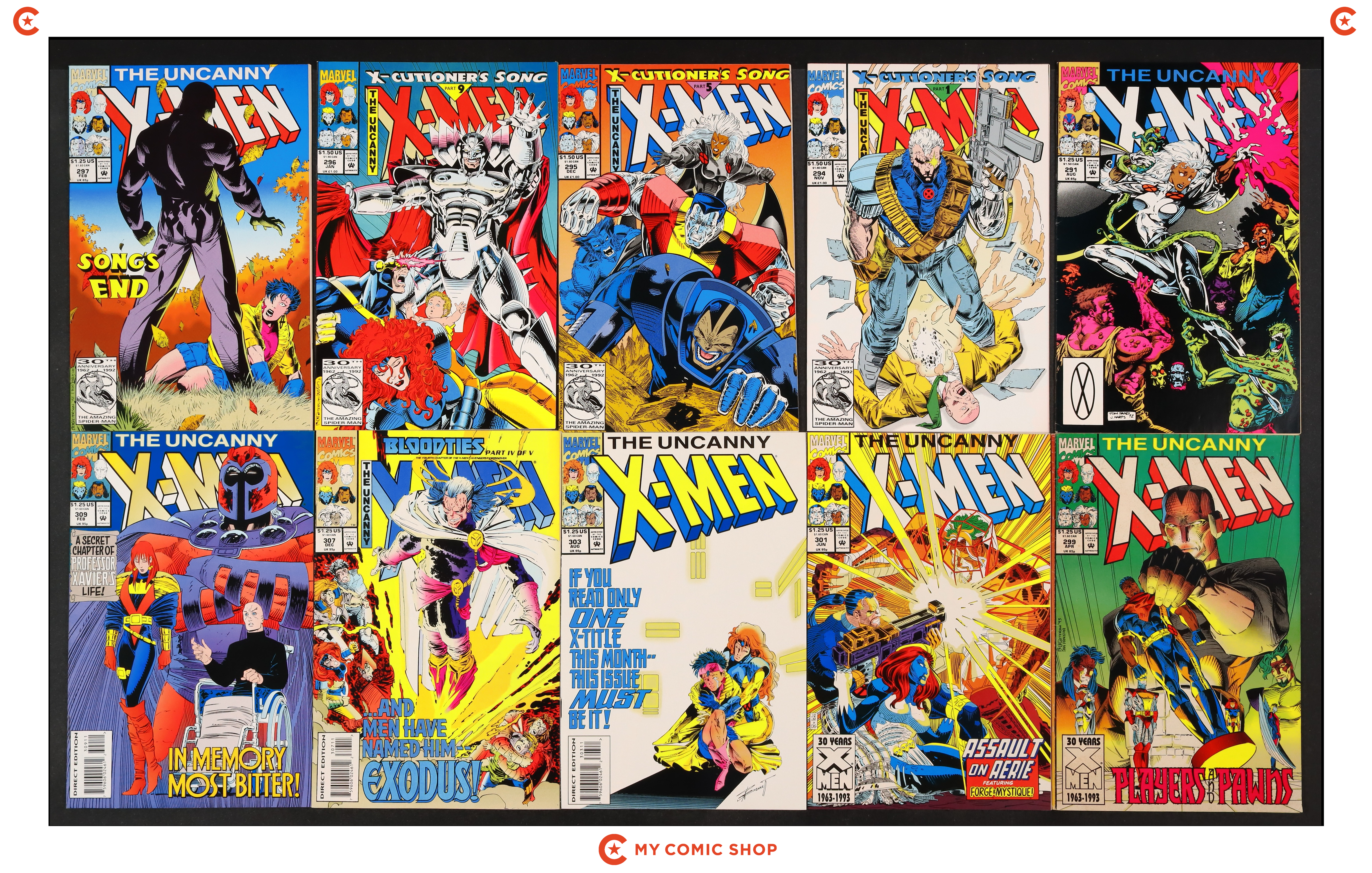 Issues 291, 294U, 295U, 296U, 297A, 299, 301, 303A, 307A, and 309 of Uncanny X-Men (1963 1st Series). Most will grade in the VF to FN range with #299 grading VG-.