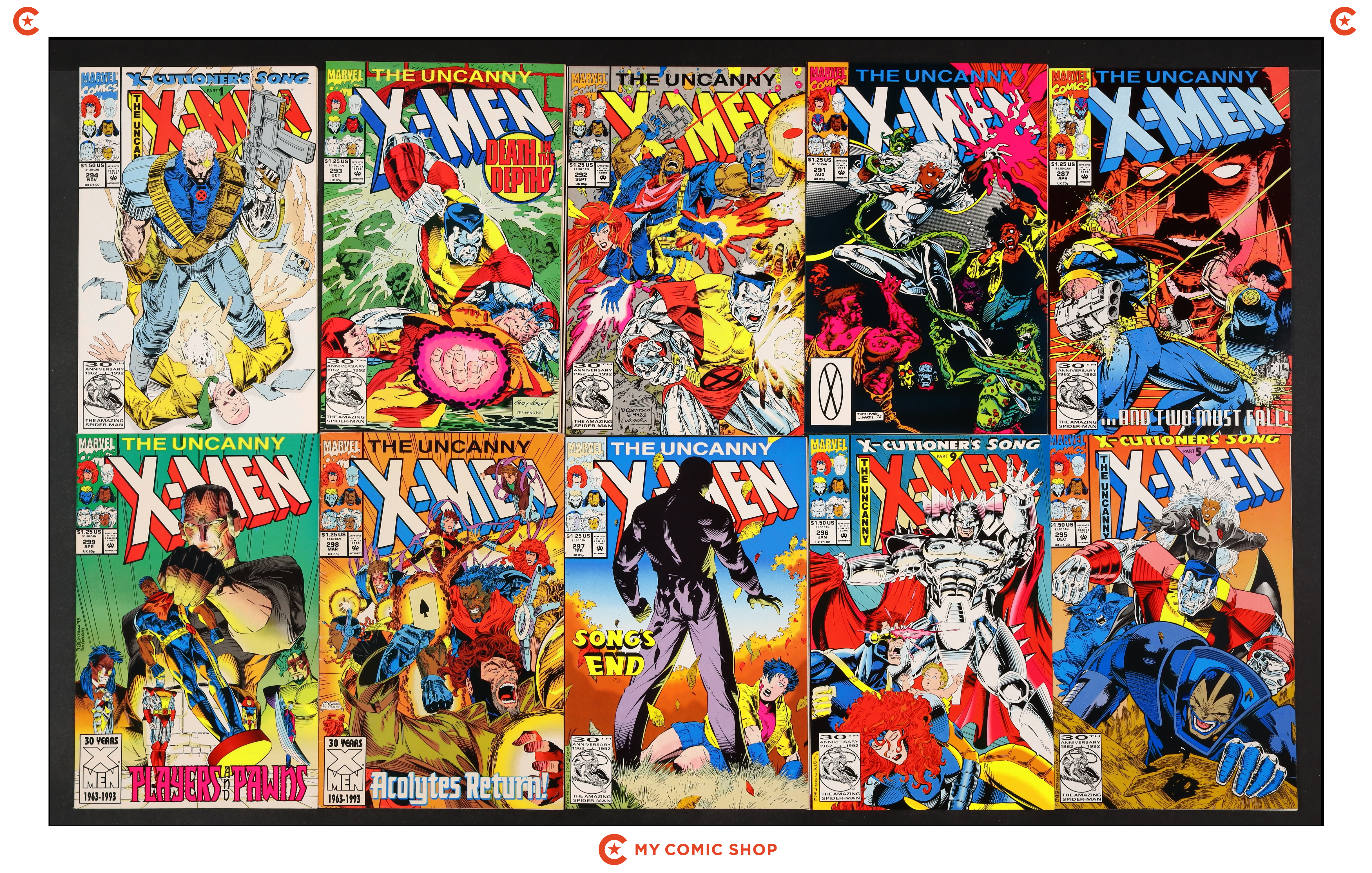 Issues 287, 291, 292, 293, 294U, 295U, 296U, 297A, 298D, and 299 of Uncanny X-Men (1963 1st Series). Most will grade in the VF to FN range with #298D grading VG.