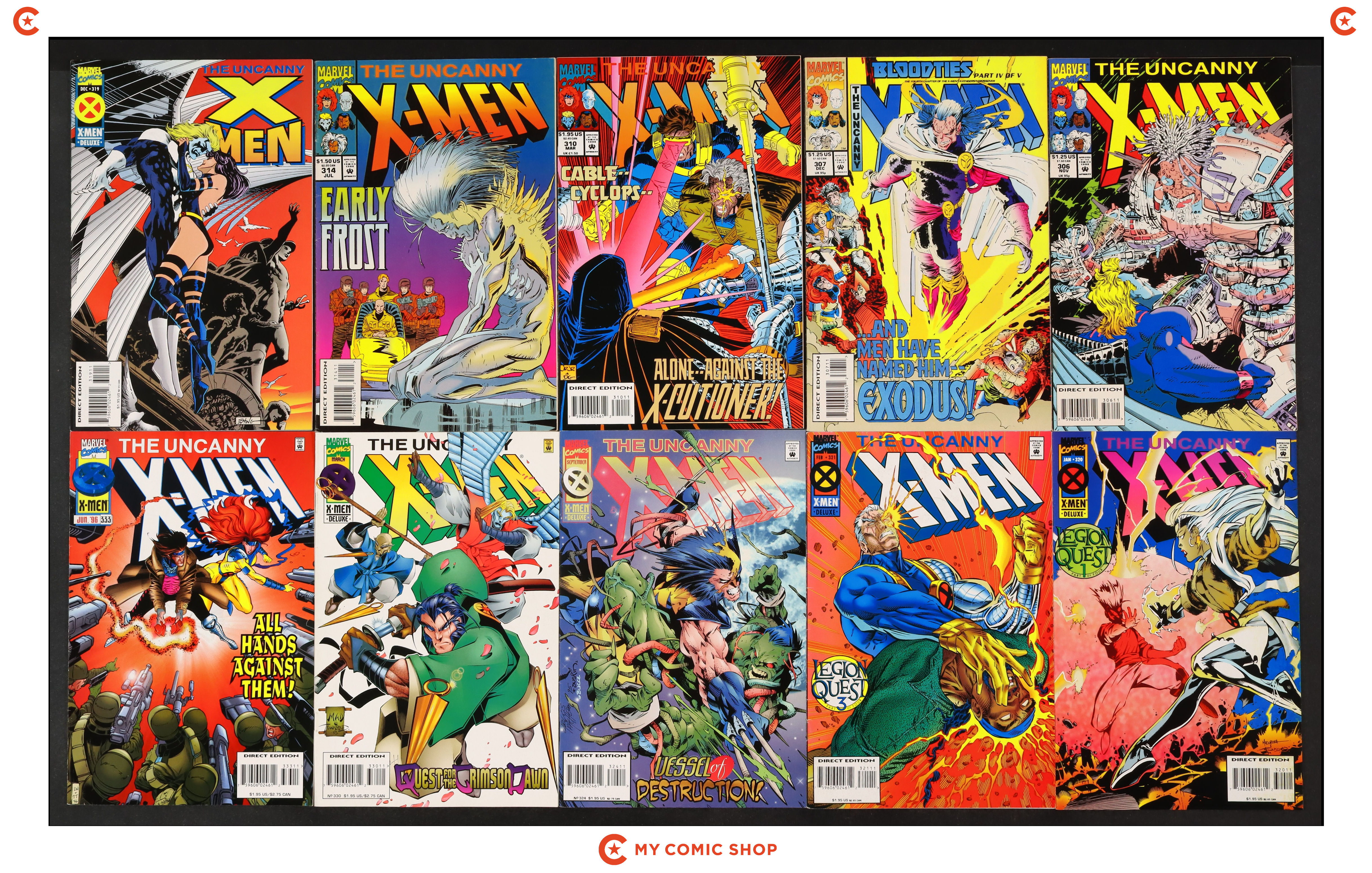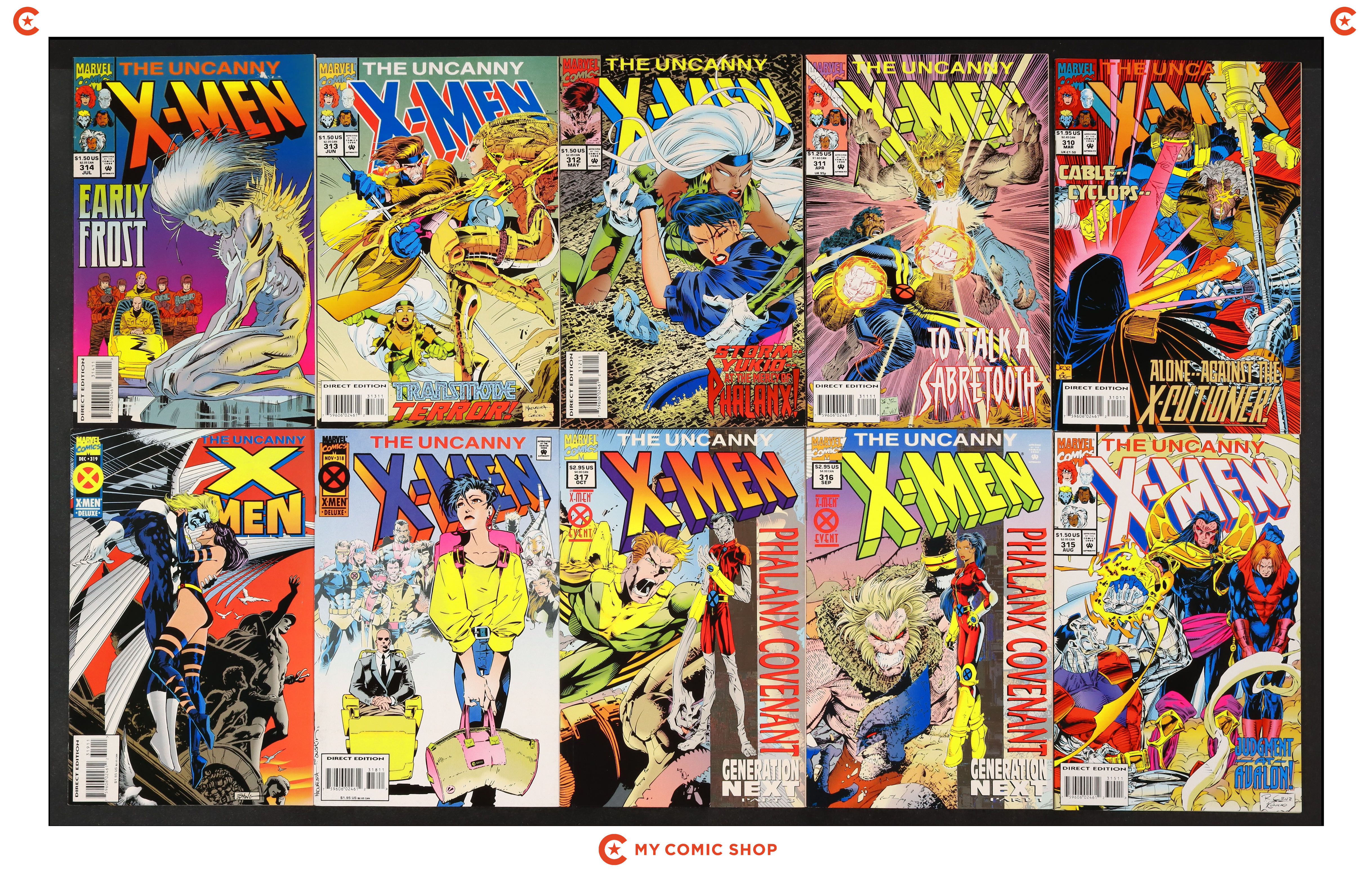 Issues 306, 307A, 310, 314, 319A-321A, 324, 330, and 333 of Uncanny X-Men (1963 1st Series). Most will grade in the FN range with a couple grading VF.