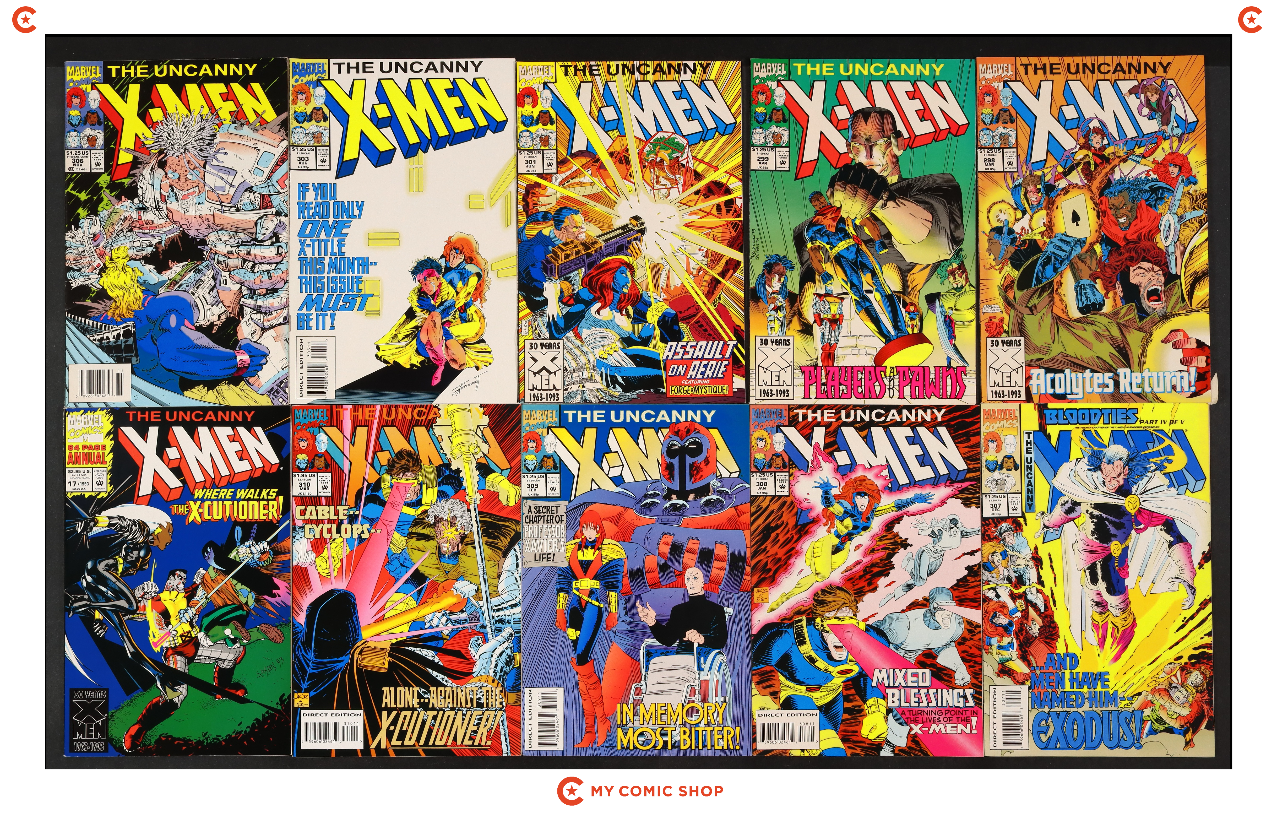 Issues 298, 299, 301, 303, 306N, 307A, and 308-310 of Uncanny X-Men (1963 1st Series); and 17U of Uncanny X-Men (1963 1st Series) Annual. Most will grade in the VF to FN range with #308 grading VG+.