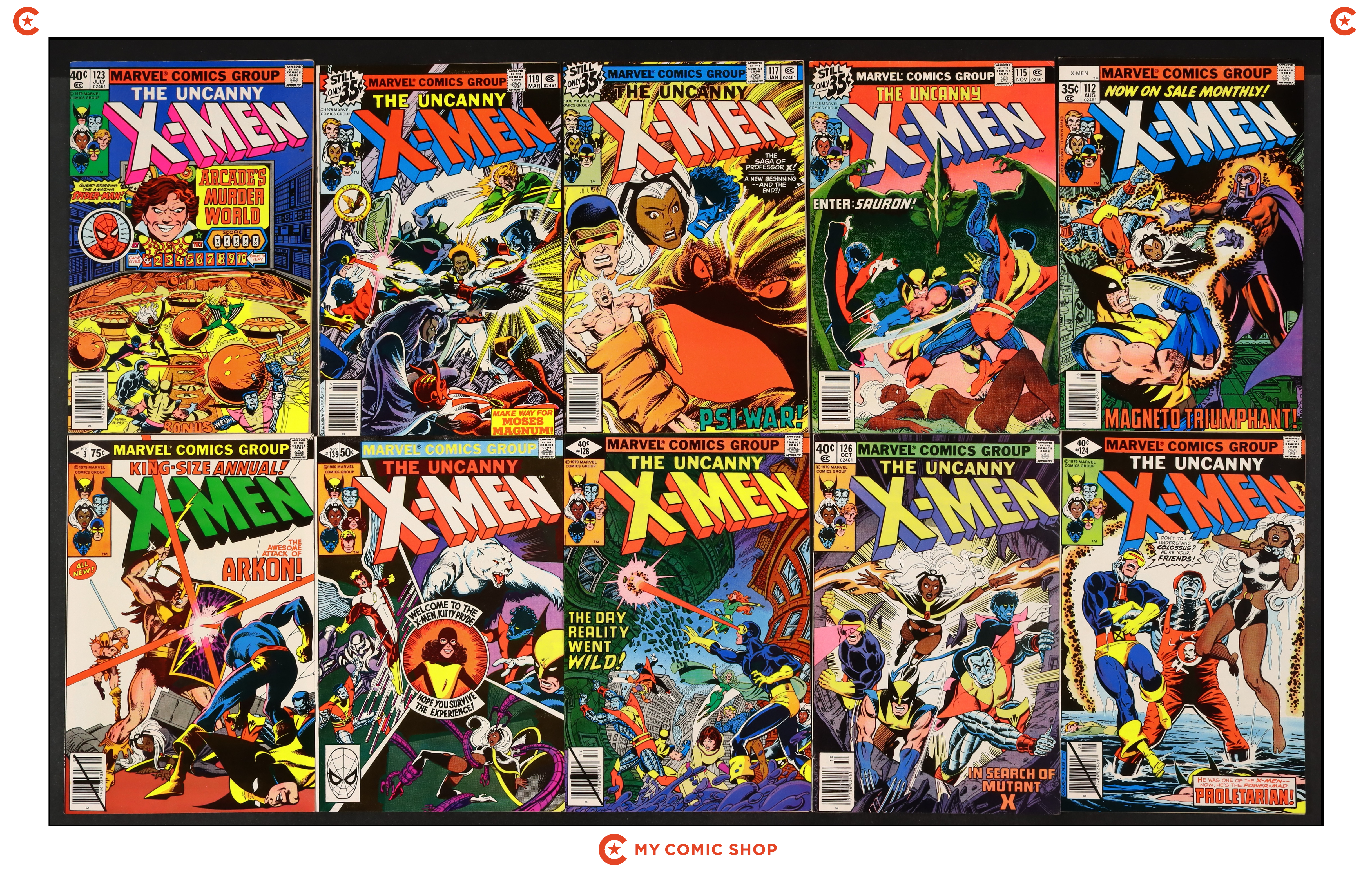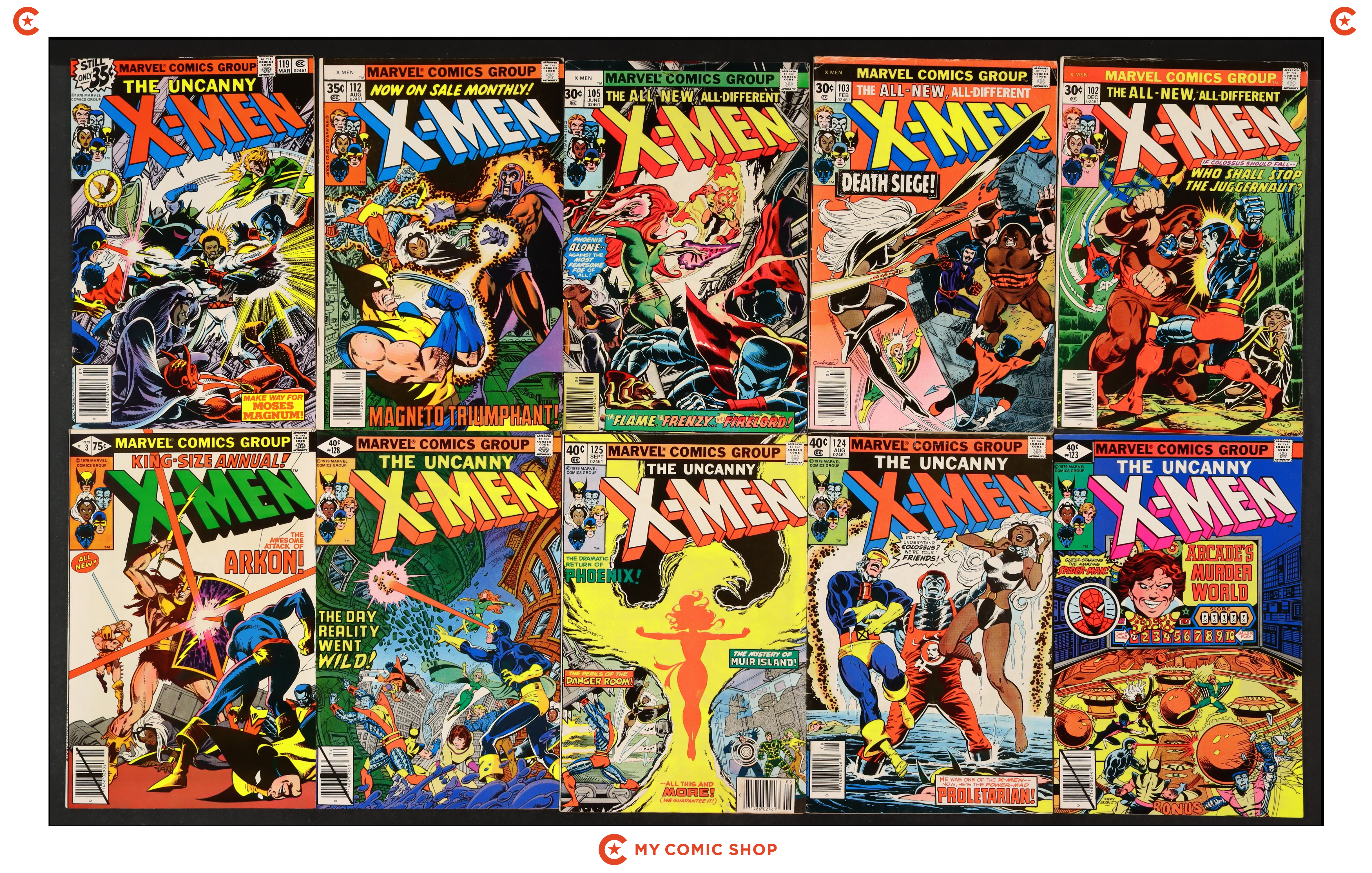 Issues 102, 103, 105, 112, 119, 123D, 124N, 125N, 128D, and Annual 3 of Uncanny X-Men (1963 1st Series). Most will grade in the GD to VG range with Annual 3 grading FN and #128D grading VF.