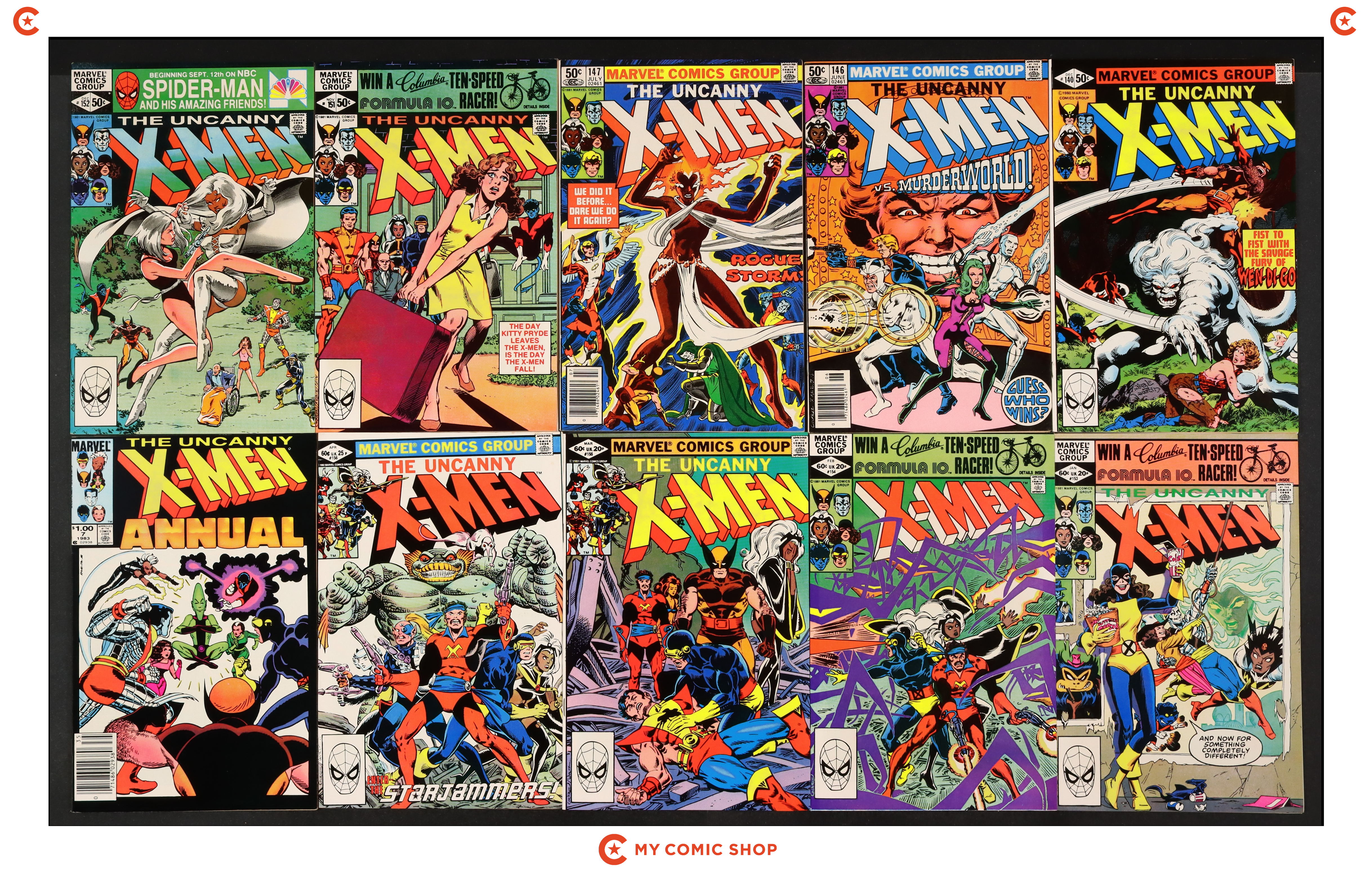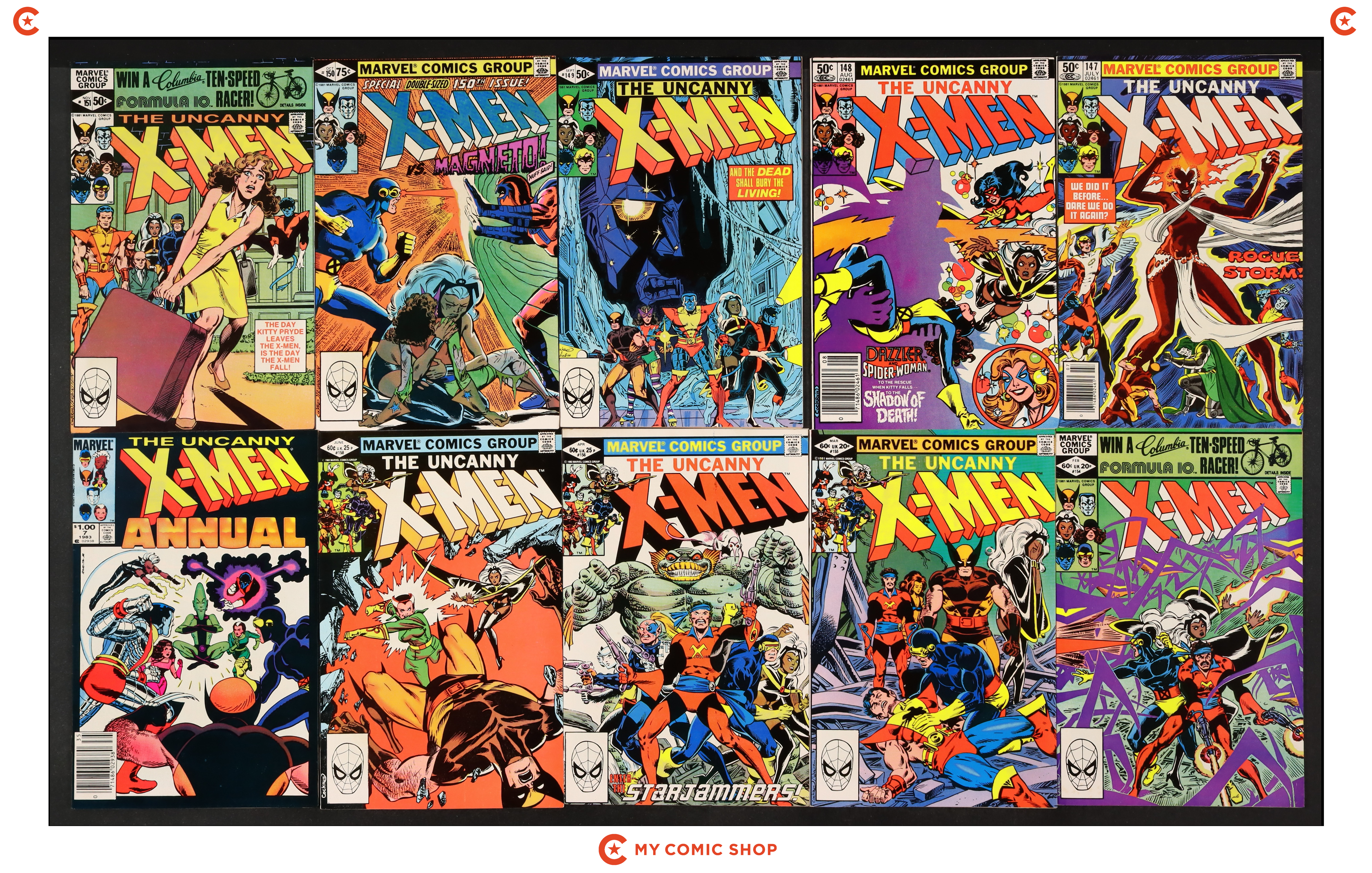Issues 147N, 148N, 149D, 150D, 151D, 154D, 155D, 156D, 158D, and annual 7 of Uncanny X-Men (1963 1st Series). Most will grade in the FN to VF range.