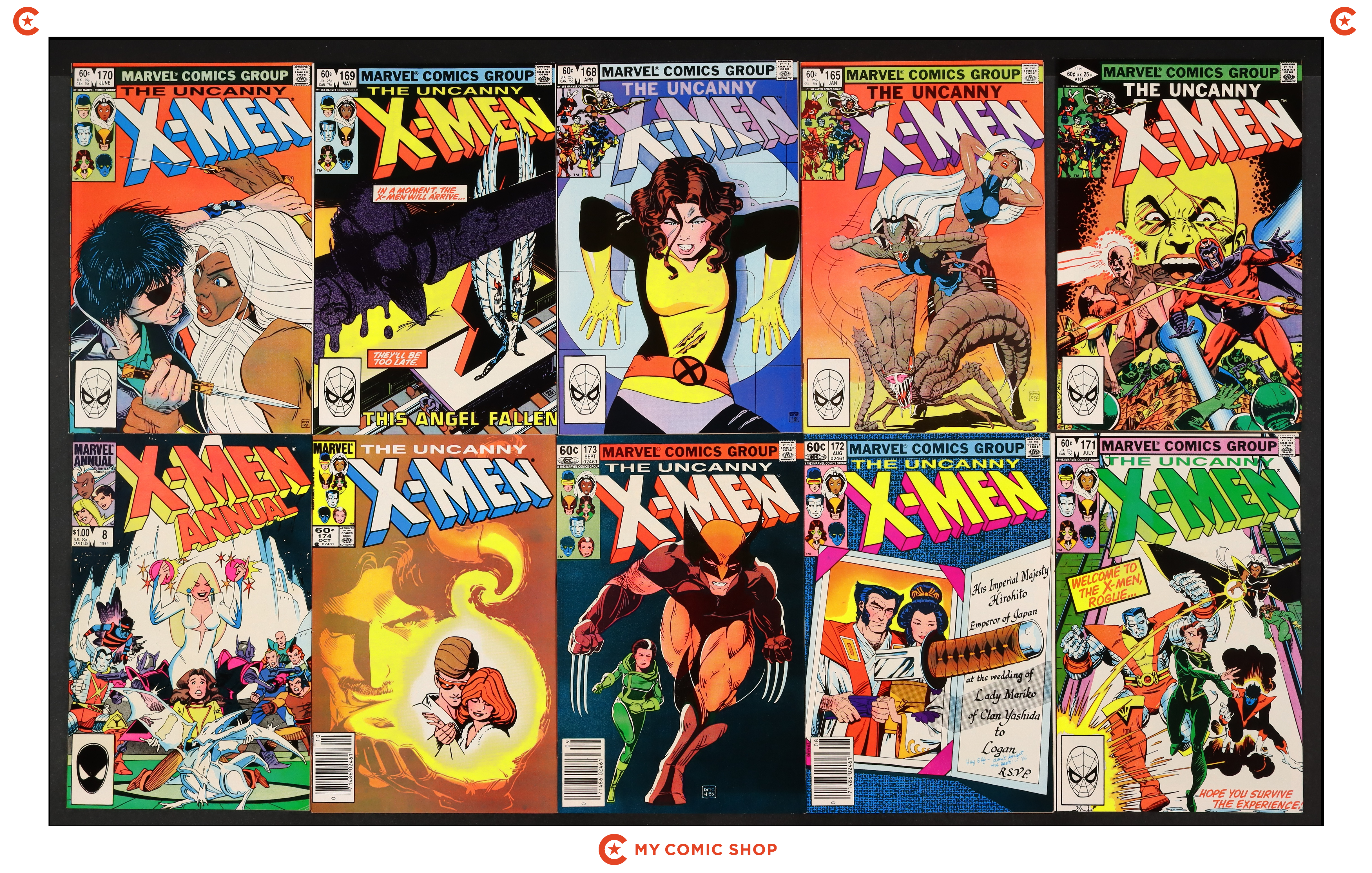 Issues 161D, 165D, 168D, 169D, 170D, 171D, 172N, 173N, 174, and annual 8D of Uncanny X-Men (1963 1st Series). Most will grade in the FN to VF range.